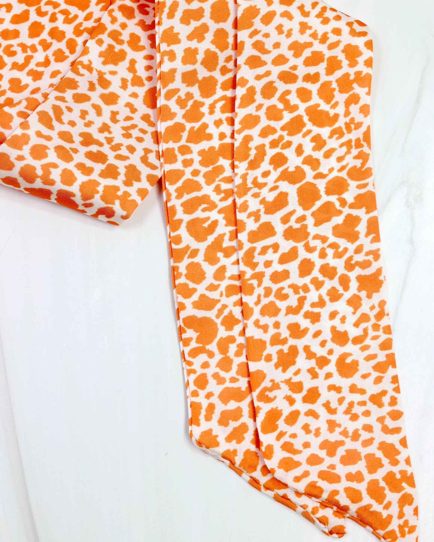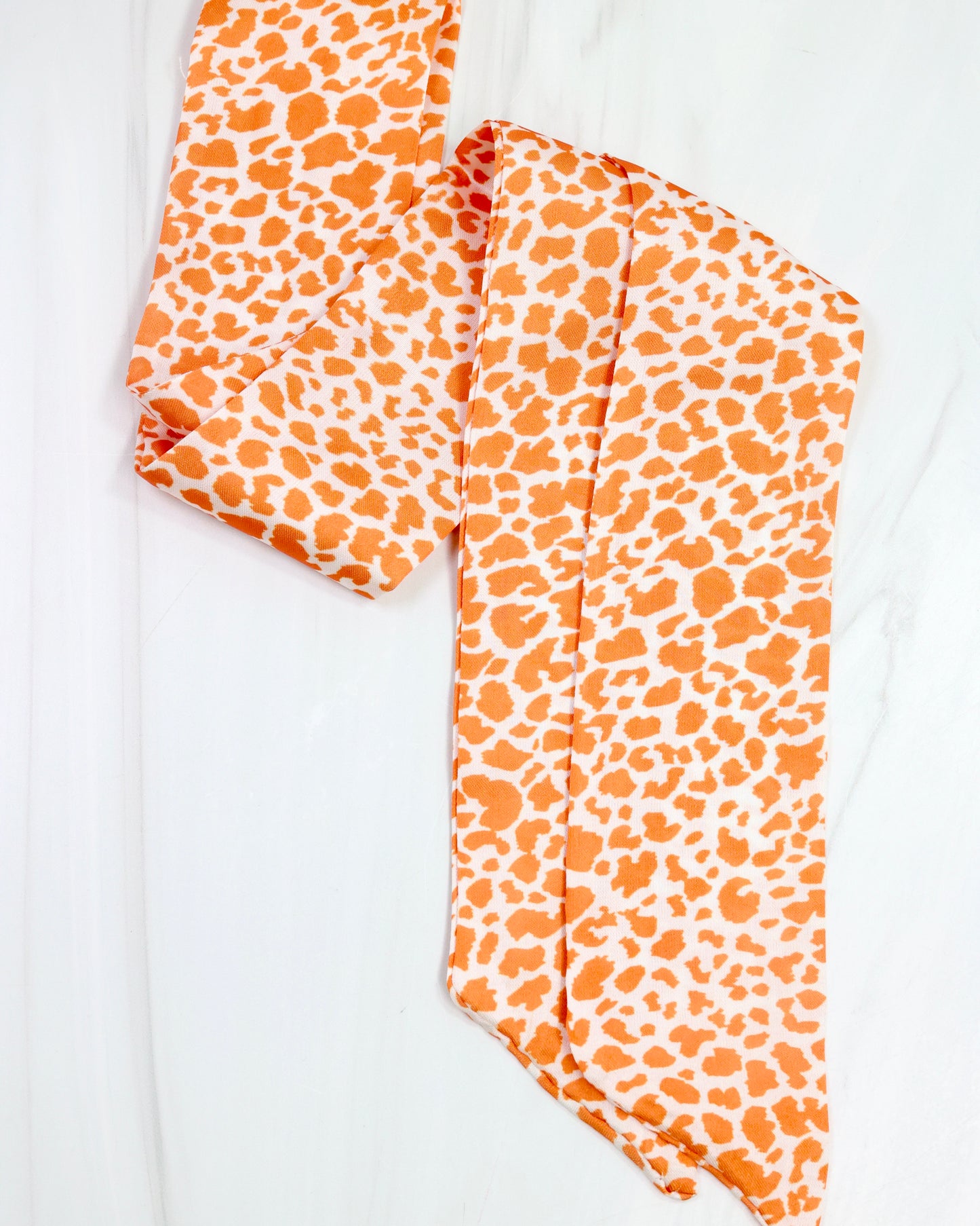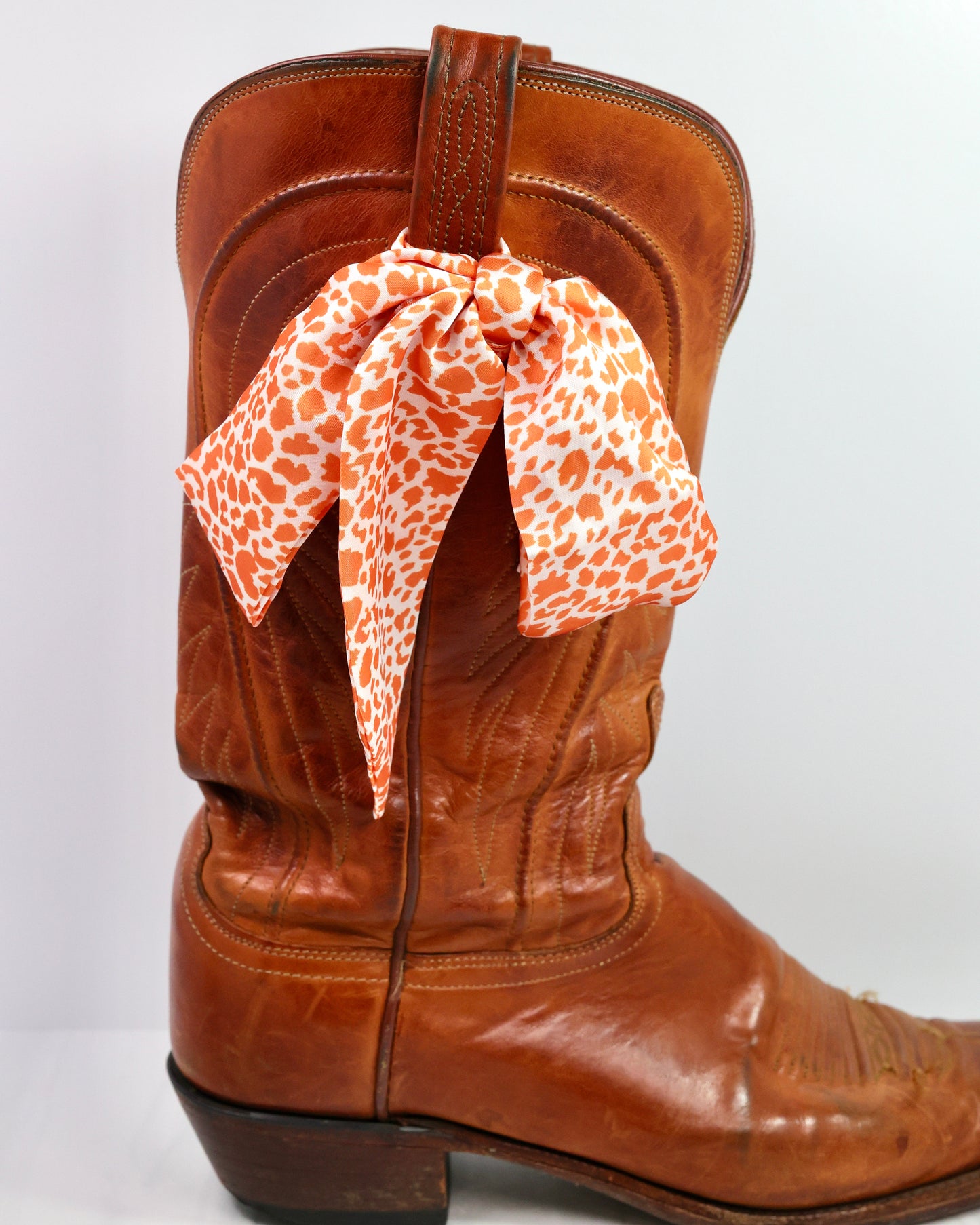 Add a stylish touch to any outfit with the Serafina Scarf in a fun Orange and White leopard print. Its smooth satin-like texture makes it perfect for tying around your neck, wrist, bag, or even your cowgirl boots, adding a playful and fashionable flair wherever you wear it.