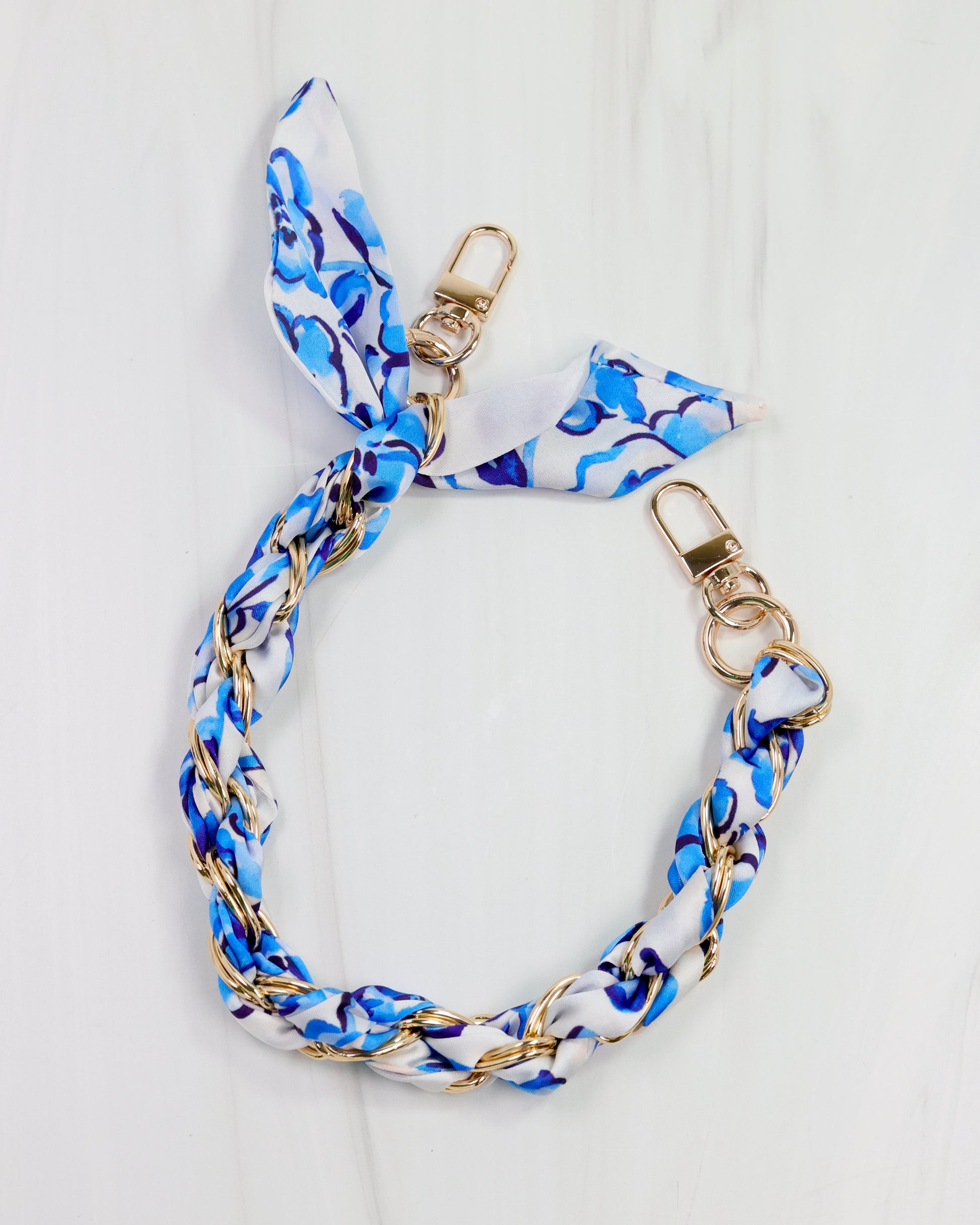 Elevate your accessory game with the Serafina Scarf Purse Chain in a beautiful Blue and White floral print. Featuring a chic gold link chain intertwined with a stylish printed scarf, this piece effortlessly combines school spirit with sophisticated fashion. Perfect for adding a refined yet spirited touch to your favorite handbag.