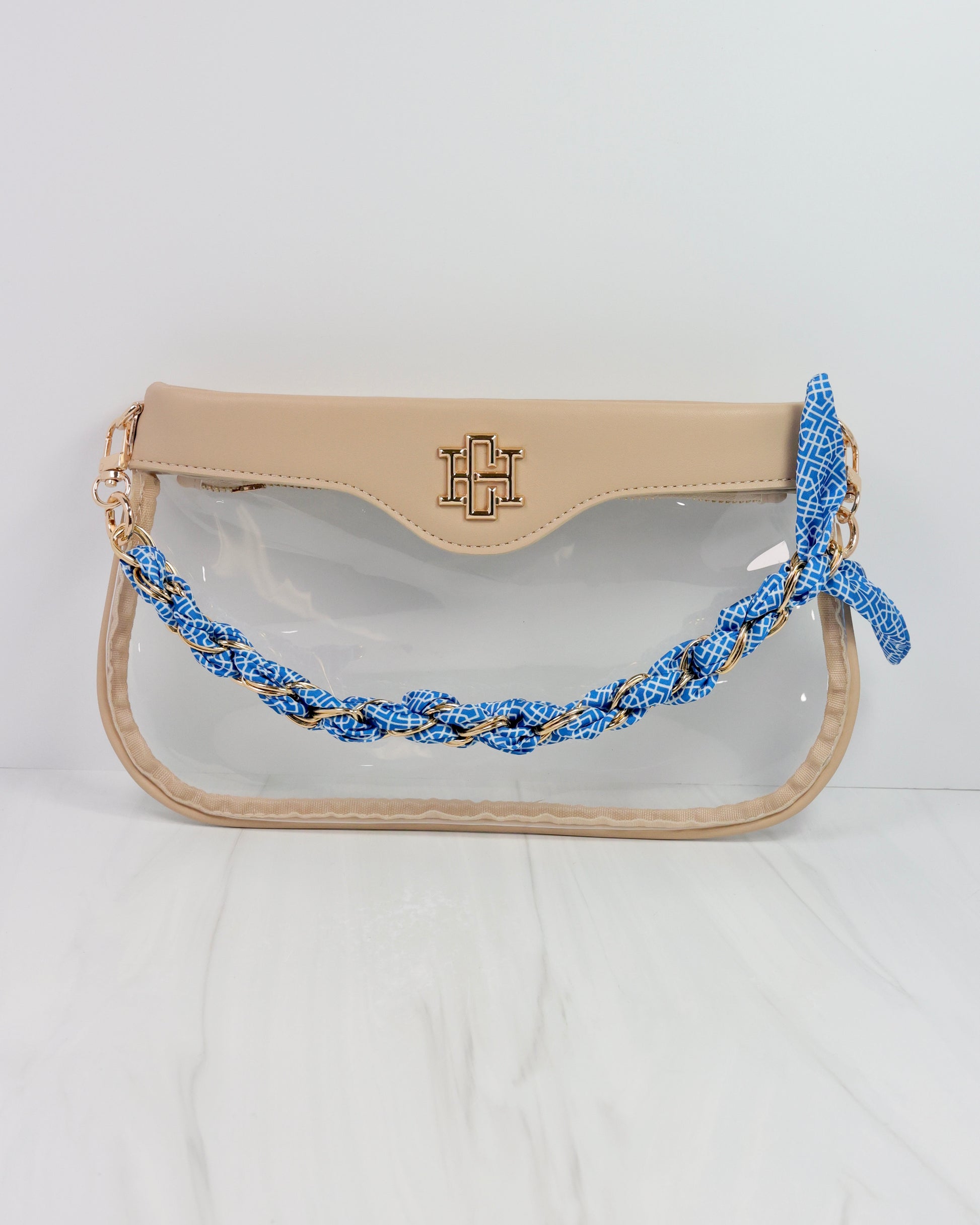 Elevate your accessory game with the Serafina Scarf Purse Chain in a fun Blue and White geometric print. Featuring a chic gold link chain intertwined with a stylish printed scarf, this piece effortlessly combines school spirit with sophisticated fashion. Perfect for adding a refined yet spirited touch to your favorite handbag.