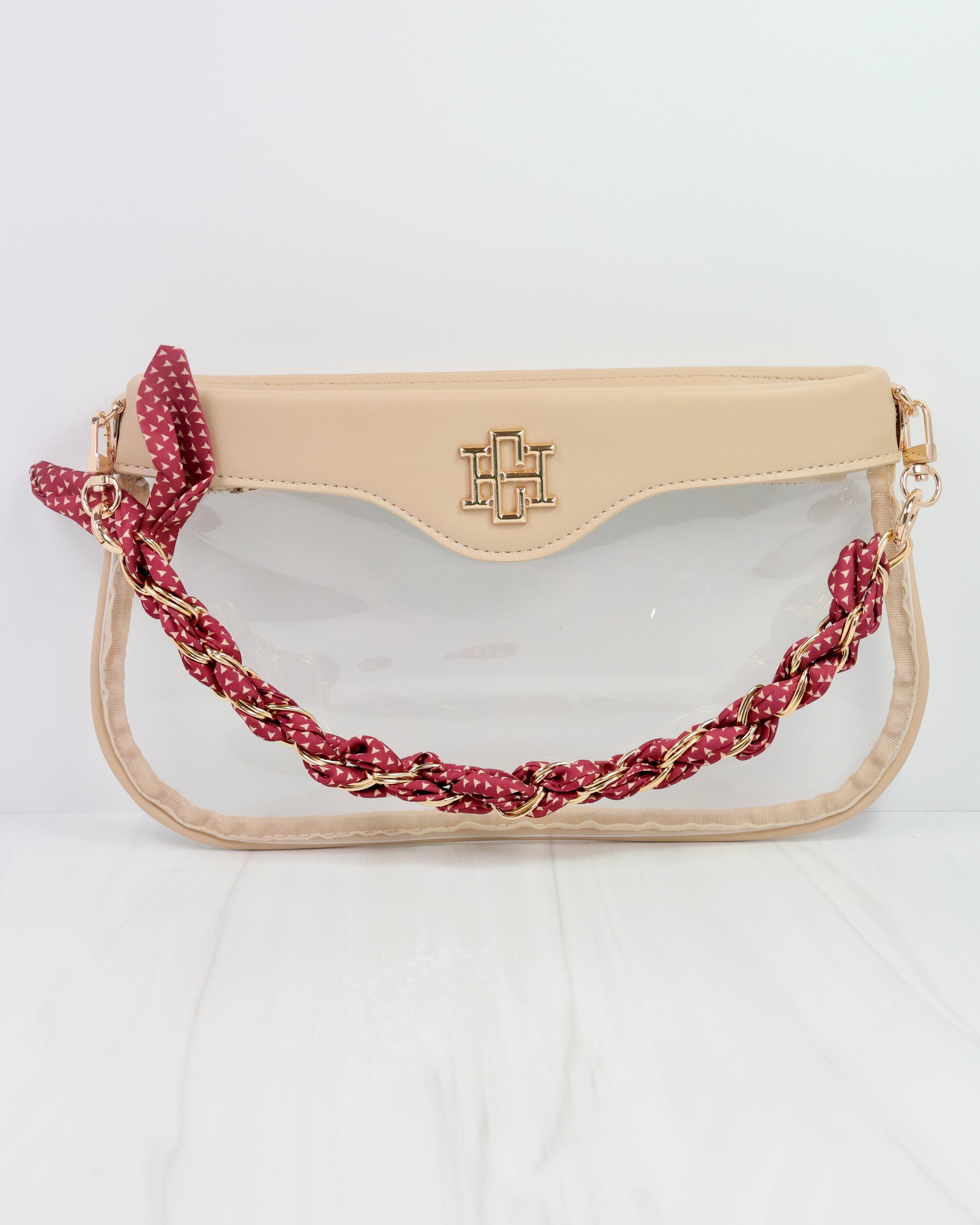 Elevate your accessory game with the Serafina Scarf Purse Chain in a beautiful Garnet print. Featuring a chic gold link chain intertwined with a stylish printed scarf, this piece effortlessly combines school spirit with sophisticated fashion. Perfect for adding a refined yet spirited touch to your favorite handbag.