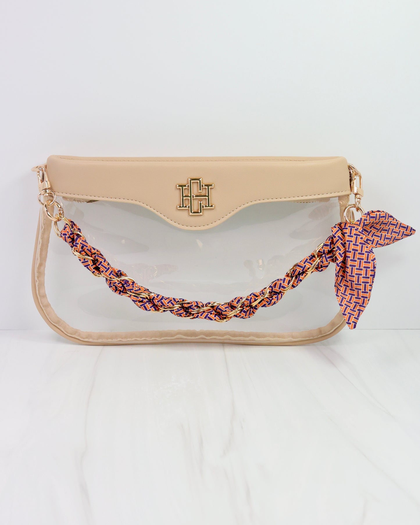 Elevate your accessory game with the Serafina Scarf Purse Chain in a beautiful Navy and Orange print. Featuring a chic gold link chain intertwined with a stylish printed scarf, this piece effortlessly combines school spirit with sophisticated fashion. Perfect for adding a refined yet spirited touch to your favorite handbag.