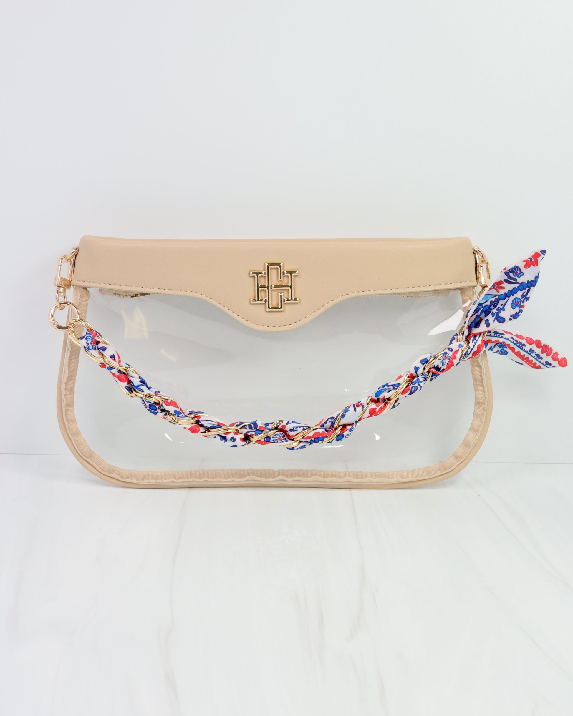 Elevate your accessory game with the Serafina Scarf Purse Chain in a fun Navy and Red floral on a white background. Featuring a chic gold link chain intertwined with a stylish printed scarf, this piece effortlessly combines school spirit with sophisticated fashion. Perfect for adding a refined yet spirited touch to your favorite handbag.