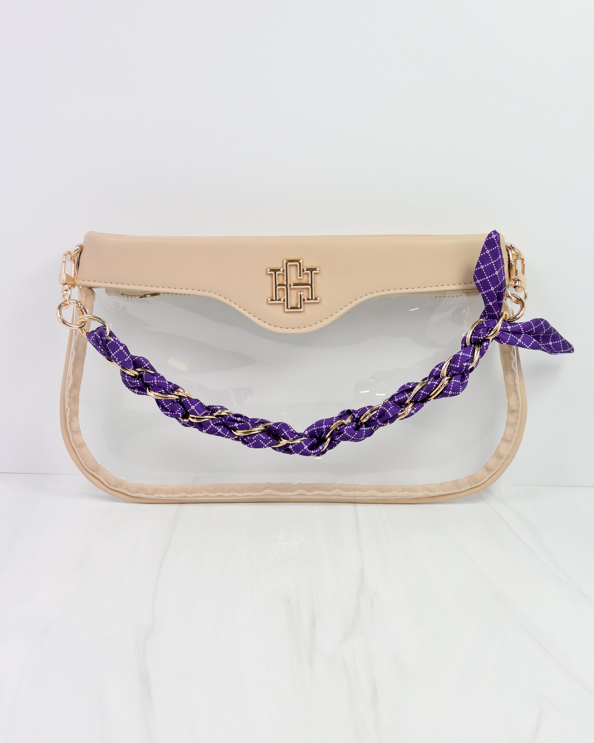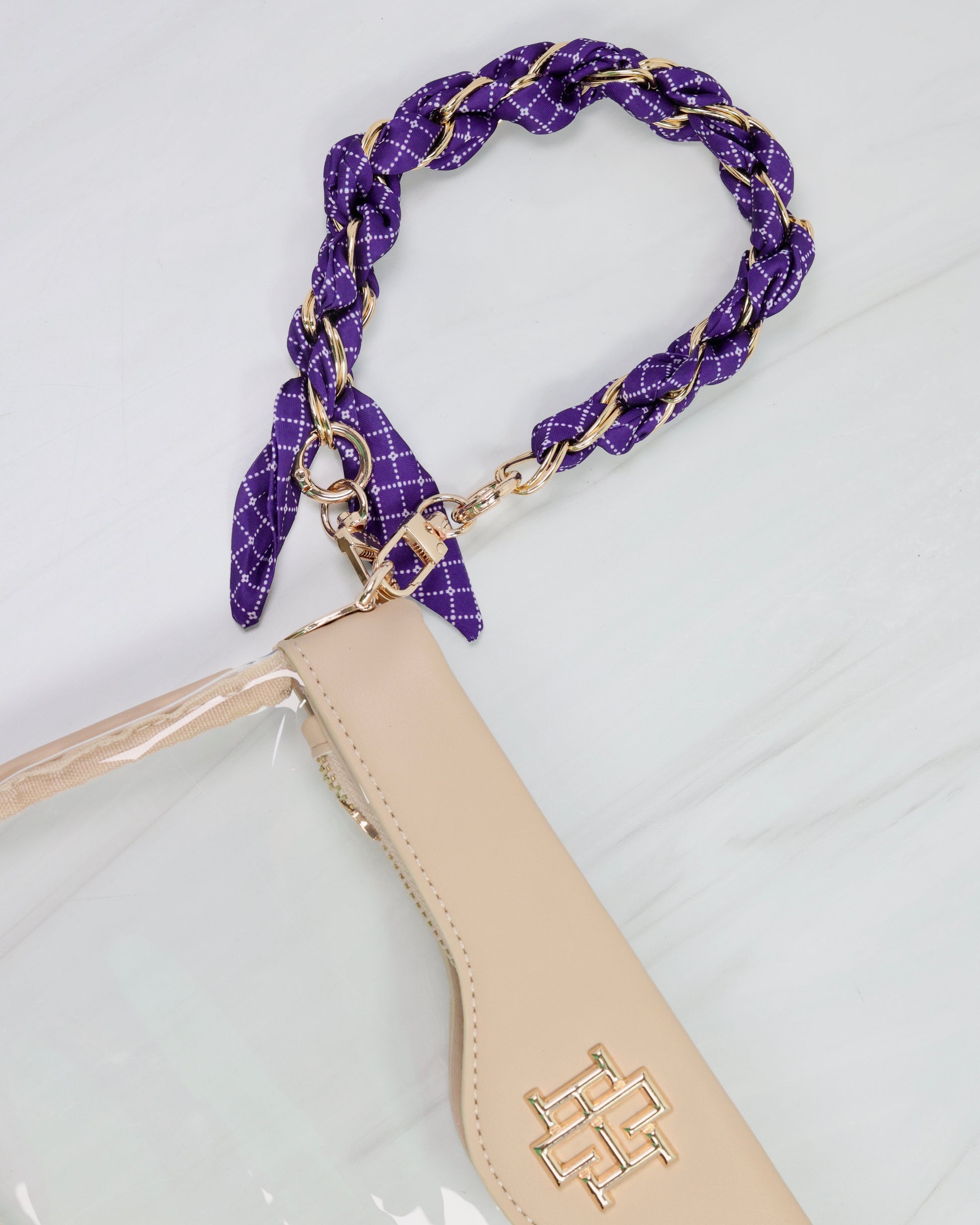 Elevate your accessory game with the Serafina Scarf Purse Chain in a purple and white print. Featuring a chic gold link chain intertwined with a stylish printed scarf, this piece effortlessly combines school spirit with sophisticated fashion. Perfect for adding a refined yet spirited touch to your favorite handbag.