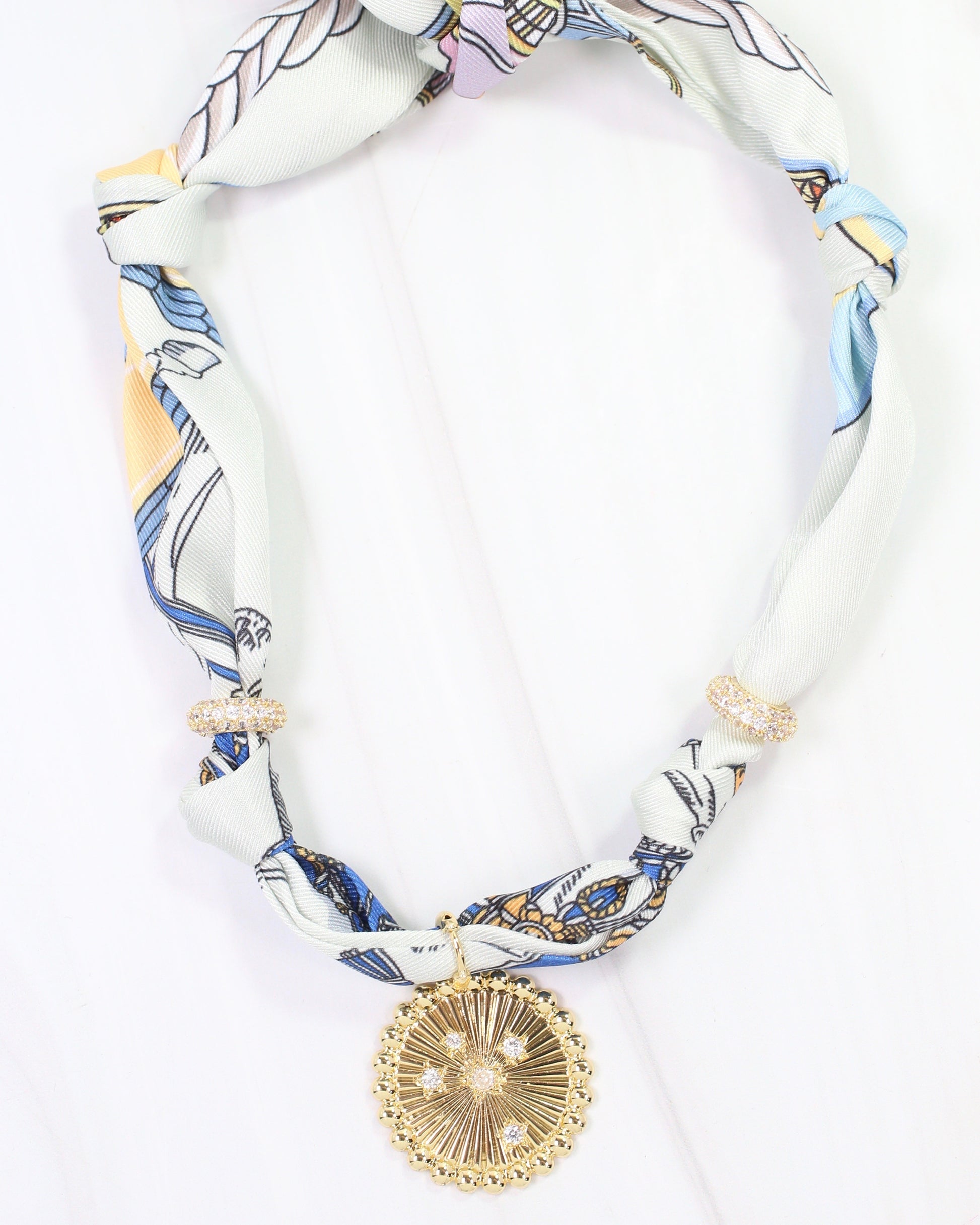 Add a pop of color with the Shannon Scarf Charm Necklace in Blue! Featuring a beautiful blue print with playful hints of light blue and yellow, this necklace shines with a gold ribbed disc charm accented by sparkling cz detail and two pave cz spacers. It’s the perfect cheerful accessory to brighten up any outfit.