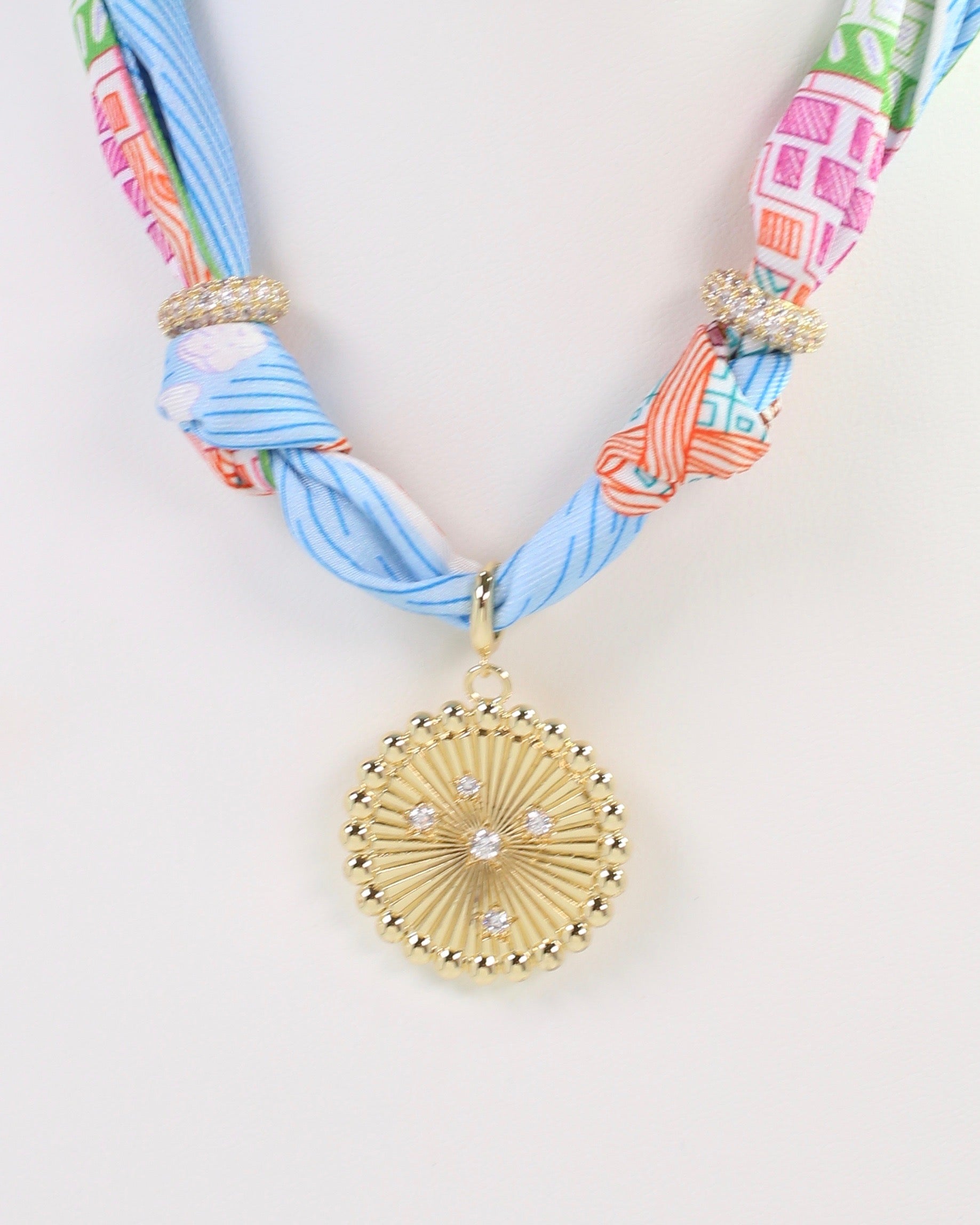 Add a pop of color with the Shannon Scarf Charm Necklace in Blue and Orange. Featuring a beautiful blue print with playful hints of multiple colors, this necklace shines with a gold ribbed disc charm accented by sparkling cz detail and two pave cz spacers. It’s the perfect cheerful accessory to brighten up any outfit.