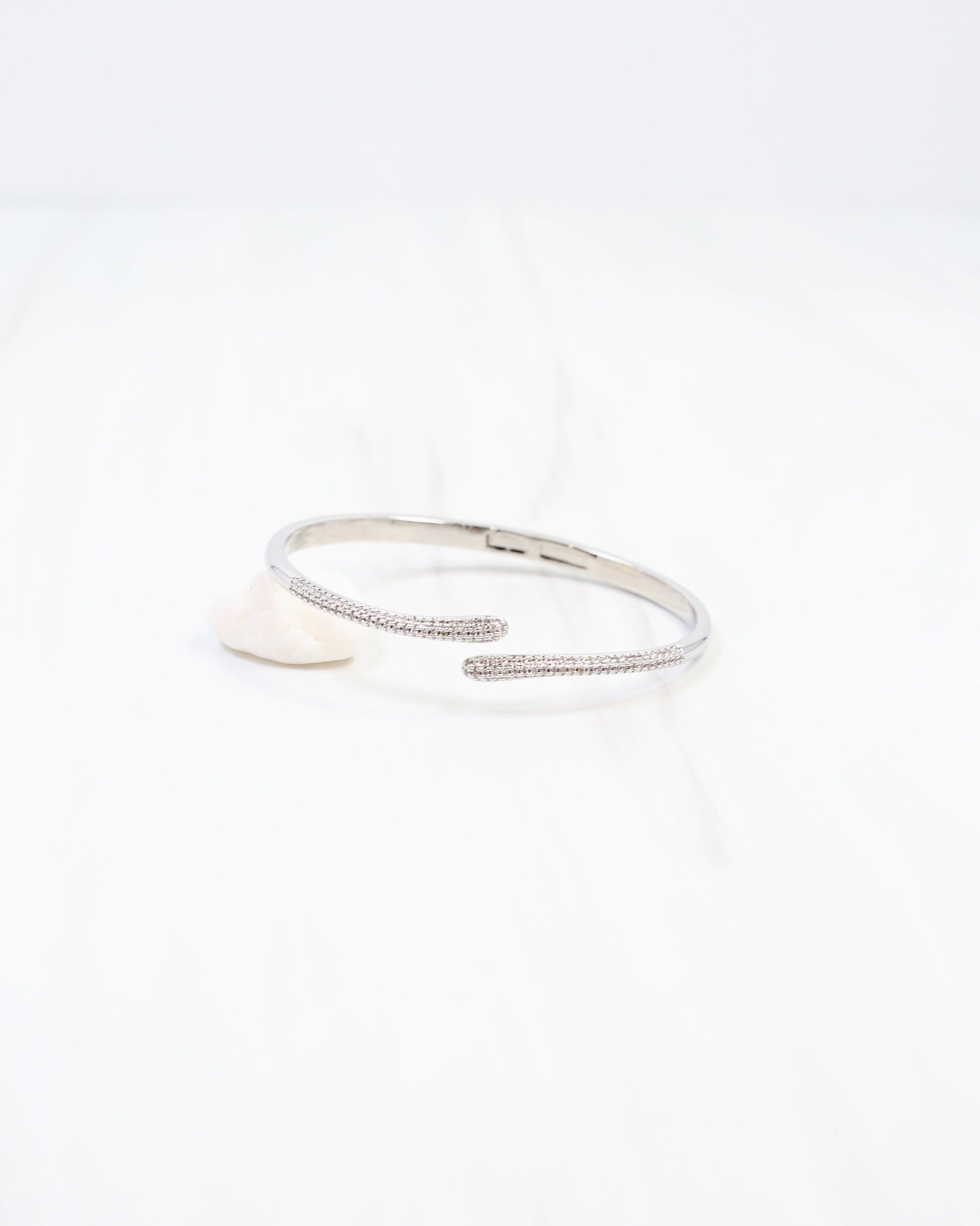 Dazzle in the Shiprock Pave Cuff Bracelet, featuring cubic zirconia stones set in a shimmering pavé pattern on white rhodium silver. This structured cuff delivers bold glamour with everyday wearability.