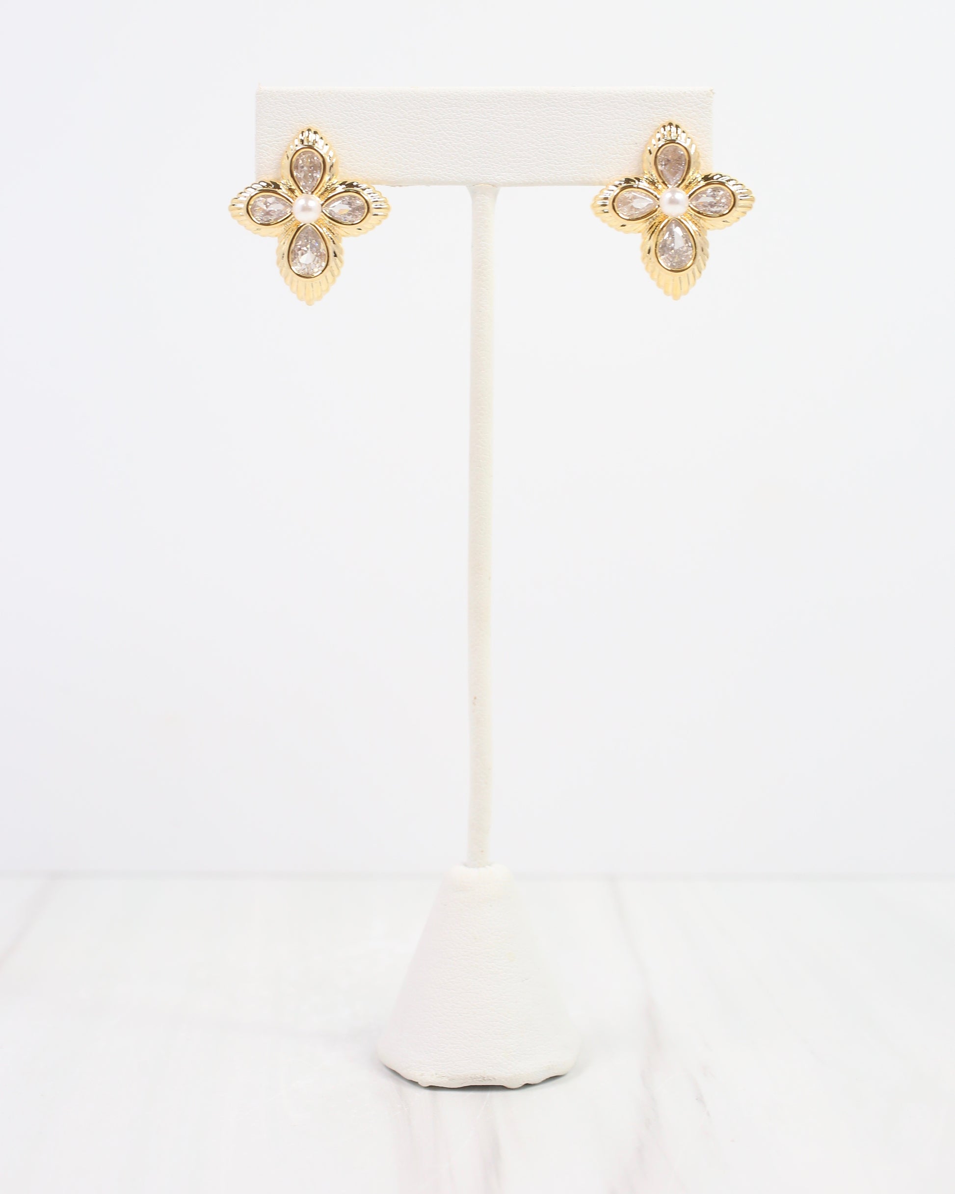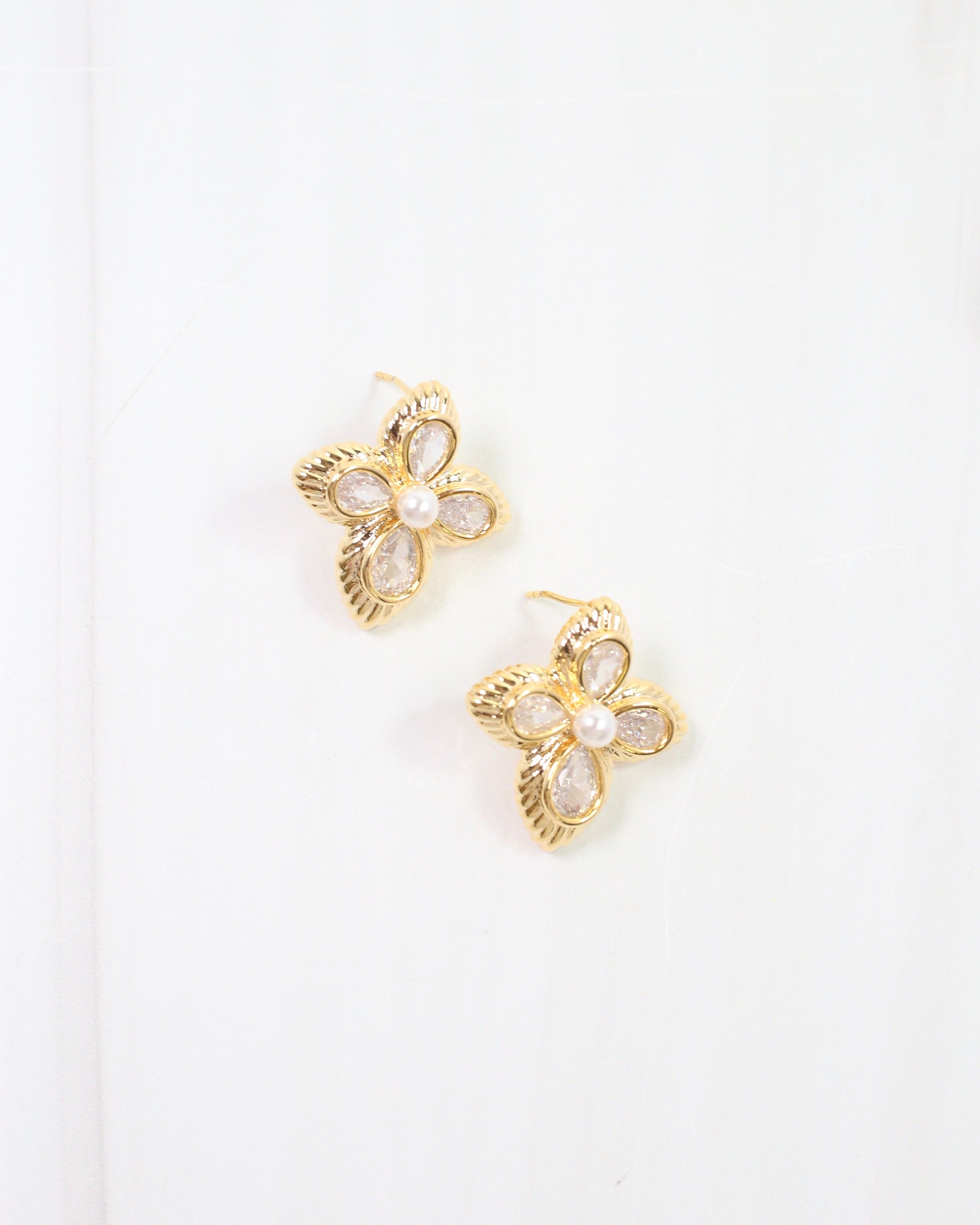 Add a touch of playful charm with the Sienna CZ Flower Earrings in Gold. Featuring sparkling CZ petals framed by a gold ribbed edge and a lustrous pearl center, these delicate earrings bring sweet flair to any outfit. Gold-dipped for lasting shine, they’re perfect for brightening your day with a fun, feminine sparkle.