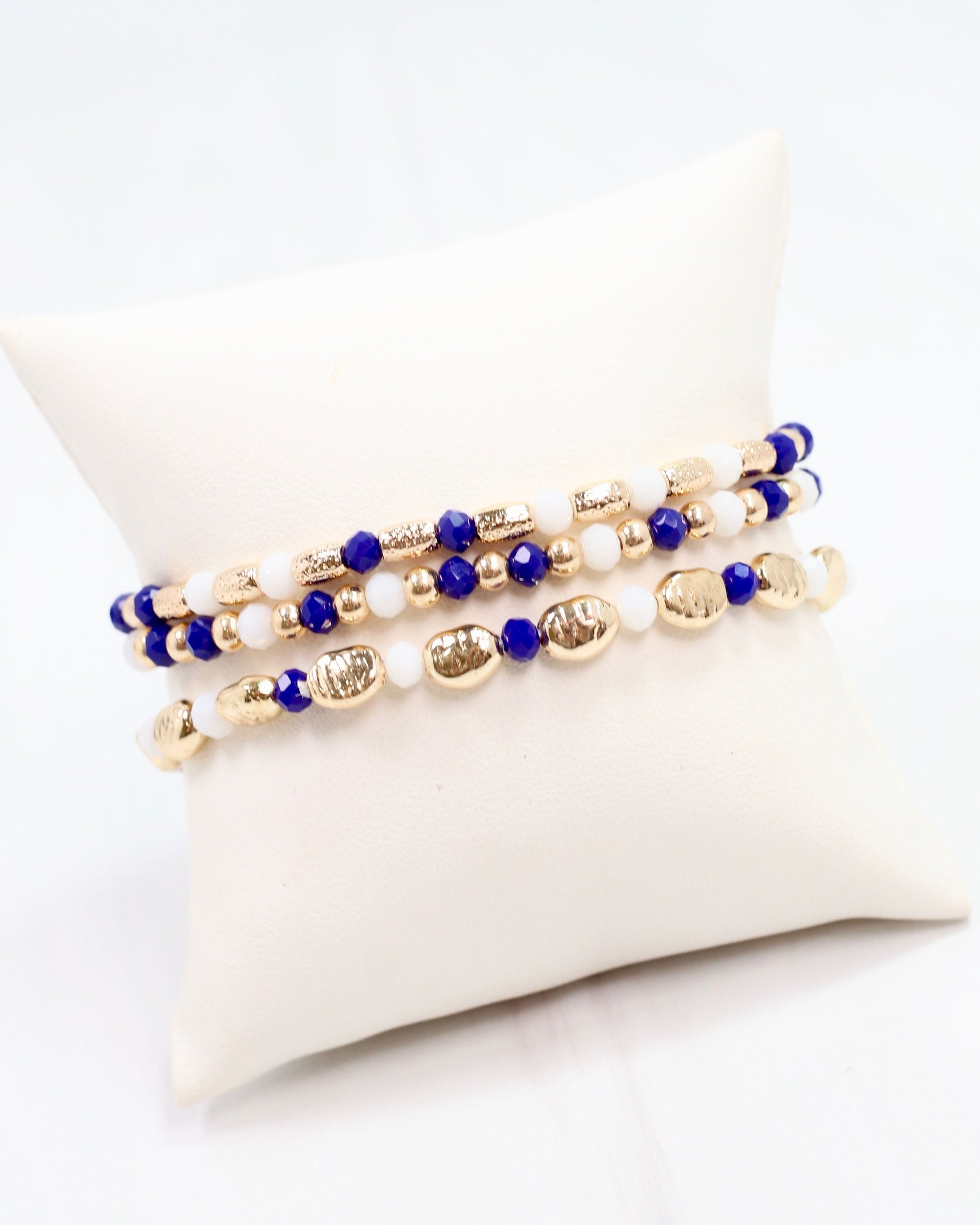 Show your team spirit with this Blue and White Beaded Bracelet Set! Three uniquely patterned stretch bracelets that stack perfectly together or mix with your other gold accessories. Perfect for game day or any day you want to flaunt your team colors. Stack 'em up and cheer on your favorite squad in style. Go team go!