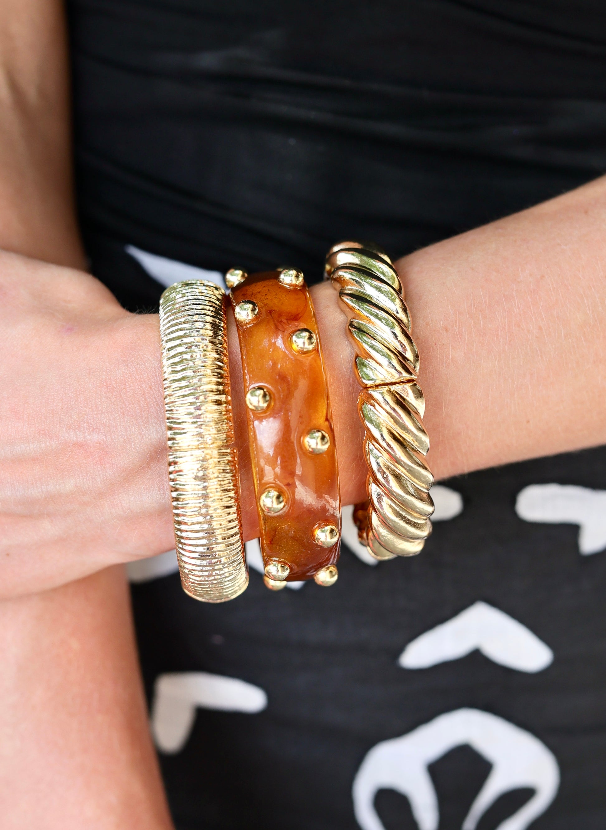Elevate your autumn style with the Studded Tortoise Bangle Set, featuring two stretch gold bracelets and a chic tortoise bangle. This must-have accessory effortlessly combines rich fall tones with elegant textures, adding a fashionable and versatile touch to any outfit. Perfect for layering or wearing solo, these bracelets bring a warm, sophisticated flair ideal for the season.
