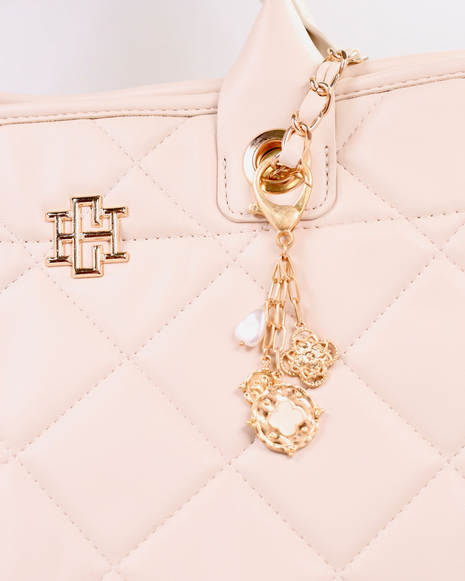 Add a touch of charm and whimsy to your bag or keys with the Susie Clover Bag Charm in Worn Gold. Featuring a gold coin with a delicate white clover, intricate filigree clover, fleur de lis, and flat baroque pearl charms, this playful accessory brings a lucky sparkle wherever you go. The sturdy lobster clasp makes it easy to attach and switch up your style anytime.