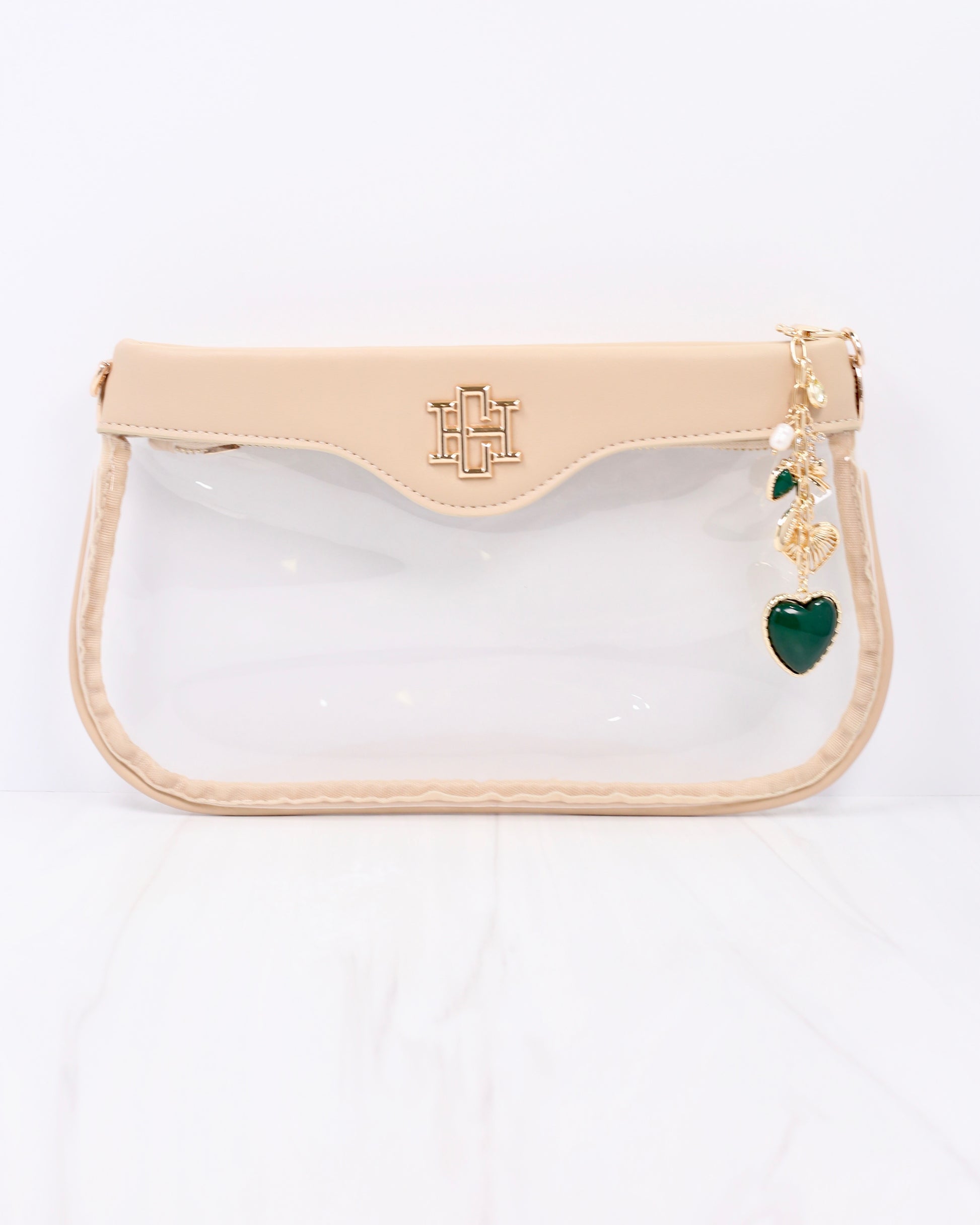 Add a stylish touch to your gameday look with the Sutton Bag Charm in green. This charming accessory features two hearts, a football, a cross, and a clover, making it a versatile piece to brighten your clear bag, use as a key chain, or pair with a scarf for a boot charm. Its playful design adds a fashionable pop of color and personality wherever you choose to wear it.