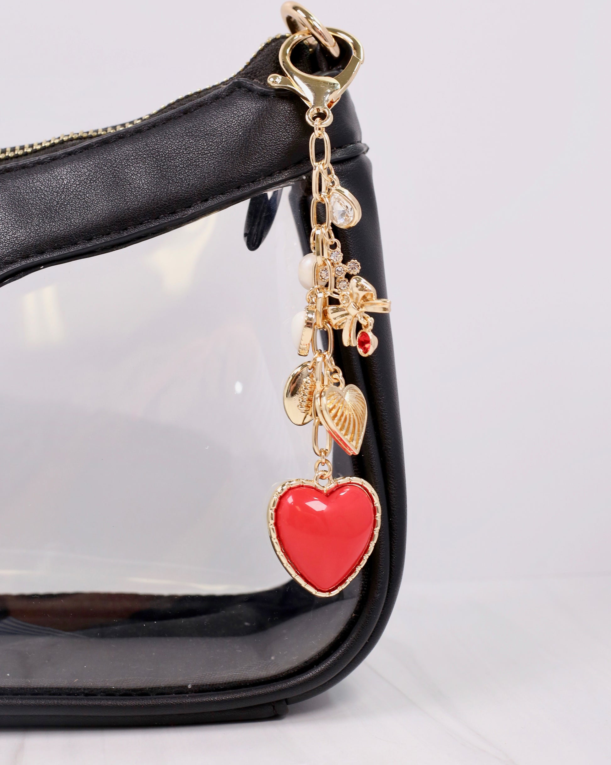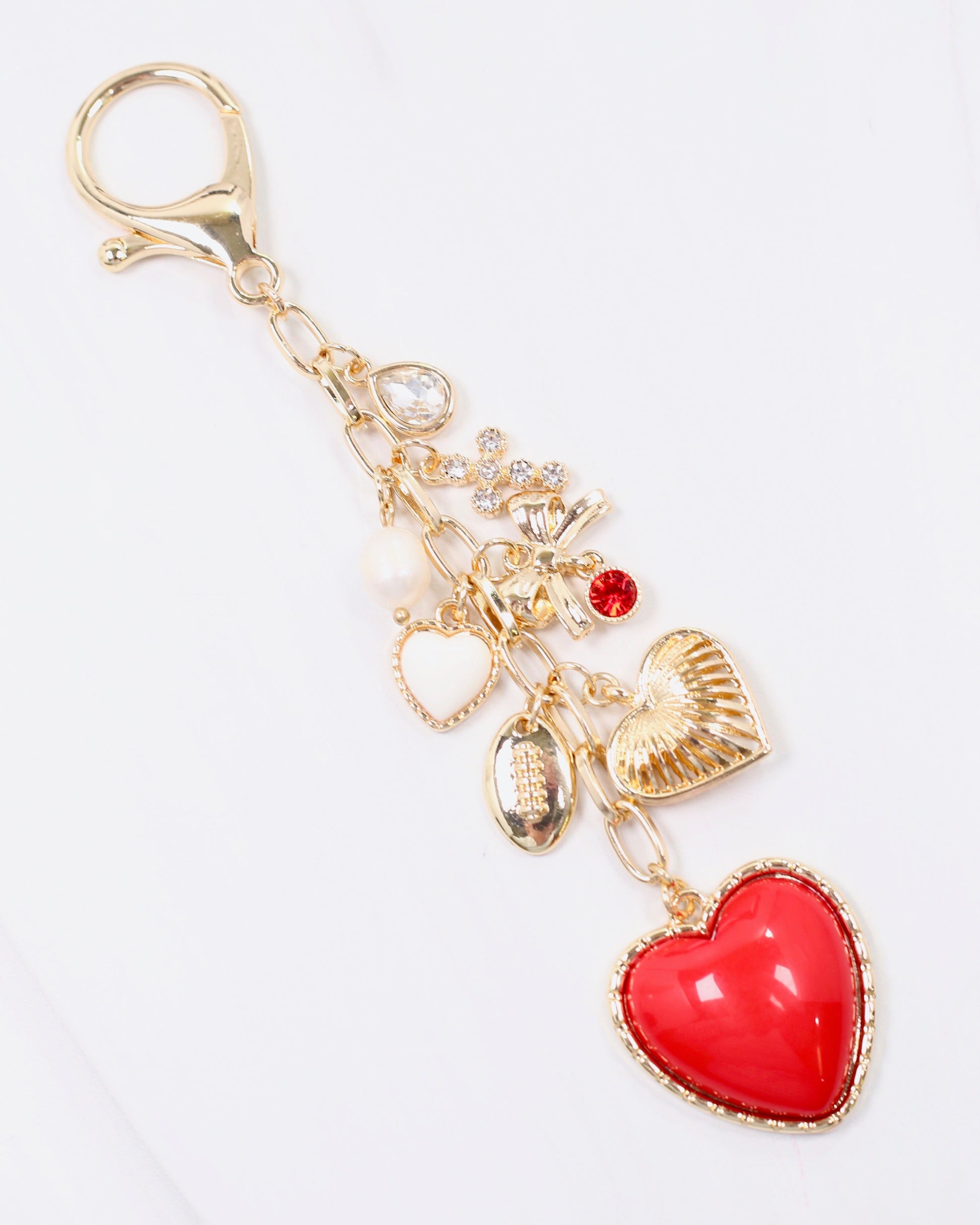 Add a stylish touch to your gameday look with the Sutton Bag Charm in red and white. This charming accessory features two hearts, a football, a cross, and a clover, making it a versatile piece to brighten your clear bag, use as a key chain, or pair with a scarf for a boot charm. Its playful design adds a fashionable pop of color and personality wherever you choose to wear it.