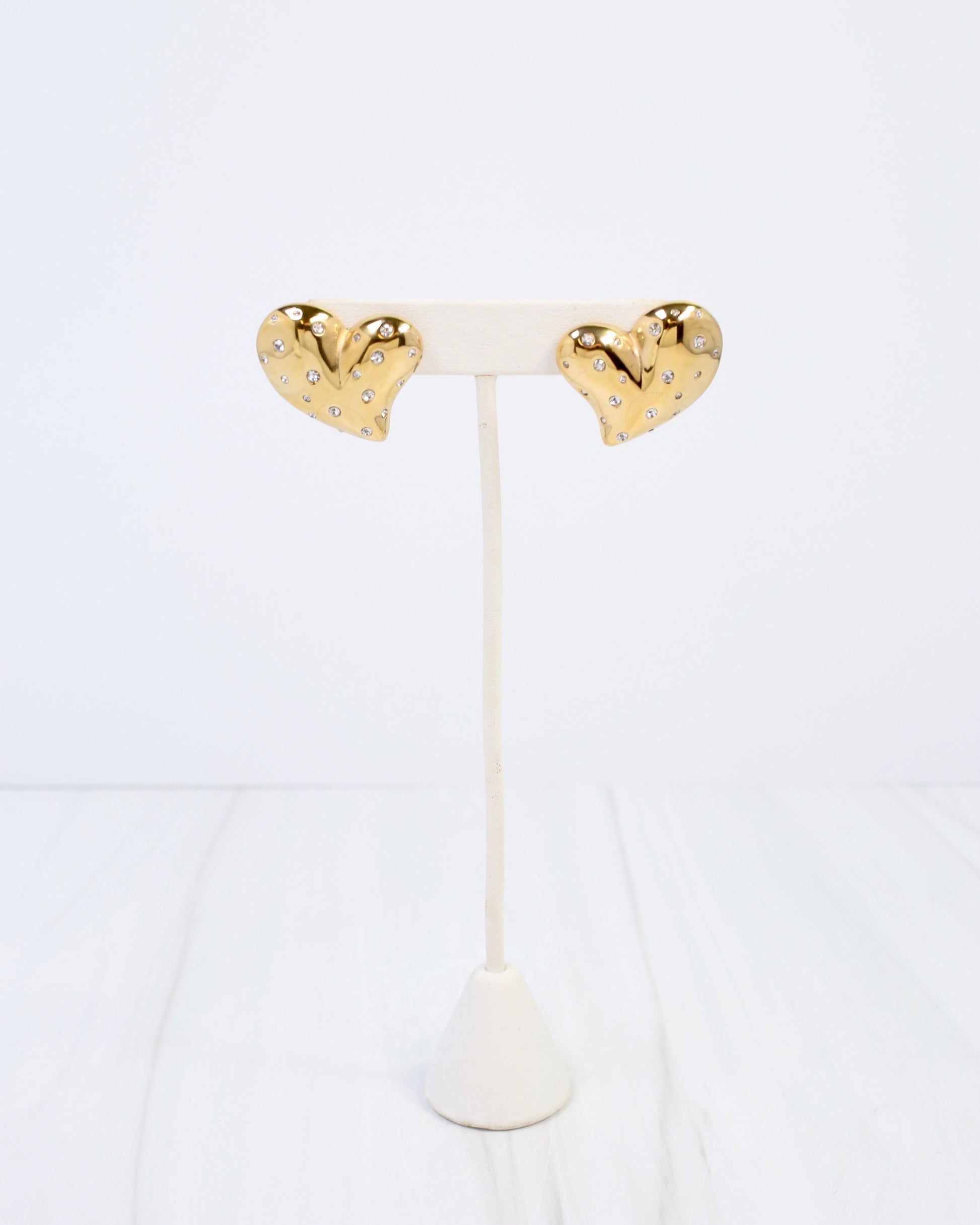 Romance meets radiance in these stunning heart earrings, adorned with sparkling cubic zirconia in a luxurious gold finish. Each piece showcases intricate embellishment that catches light from every angle, creating an enchanting sparkle. Perfect for expressing your romantic side or gifting to someone special, these earrings blend sentimental charm with contemporary glamour for a look that's both meaningful and fashion-forward.\