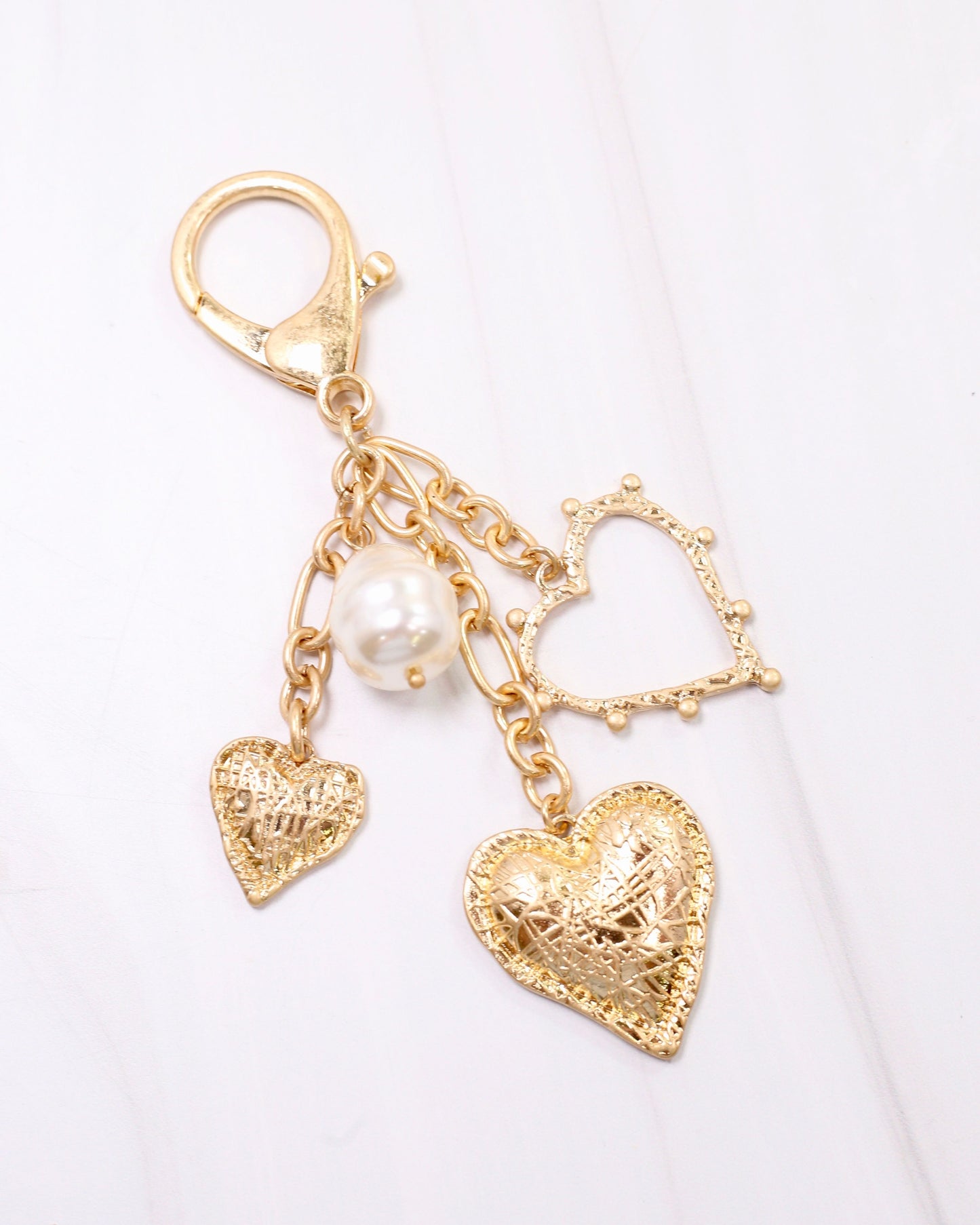 Add a touch of charm and whimsy to your bag or keys with the Tara Heart Bag Charm in Worn Gold. Featuring two textured hearts, an open heart, and a striking large baroque pearl, this playful accessory easily clips on with a lobster claw clasp. It’s a fun and stylish way to refresh your look anytime!