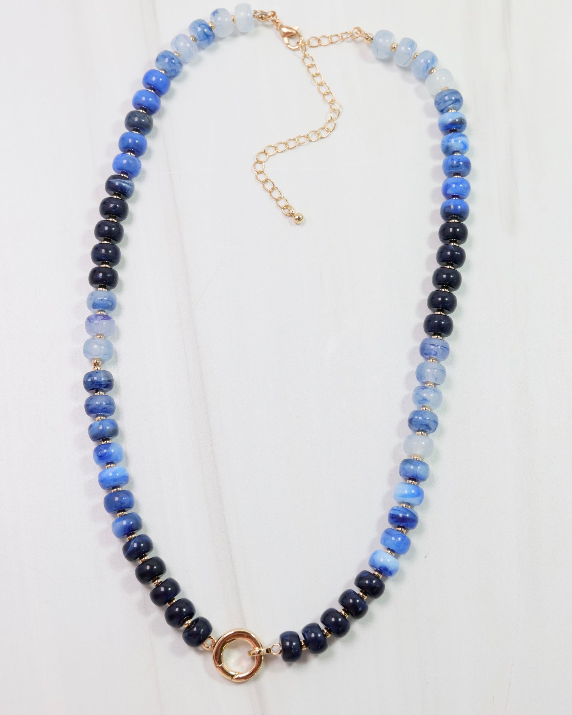The Tiara Beaded Toggle Necklace in Black showcases a variety of blue stones with a gold toggle and delicate gold spacer beads. Perfect worn alone or paired with a charm for a fun, versatile style. Adjustable clasp for the perfect fit!