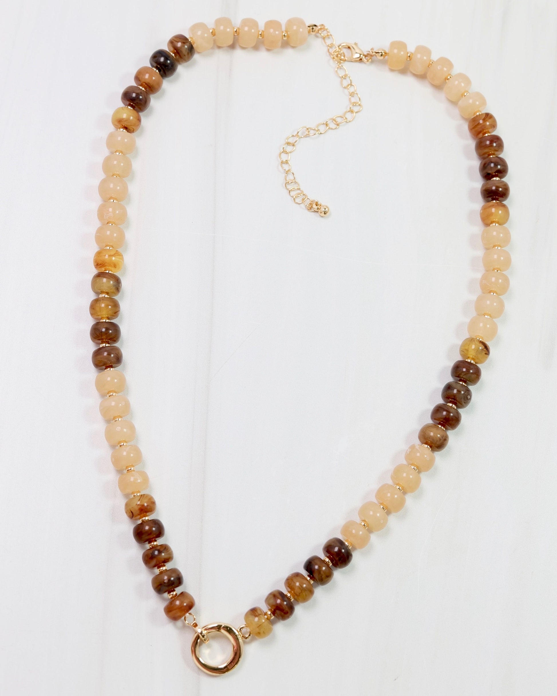 The Tiara Beaded Toggle Necklace in Black showcases brown and tan stones with a gold toggle and delicate gold spacer beads. Perfect worn alone or paired with a charm for a fun, versatile style. Adjustable clasp for the perfect fit!