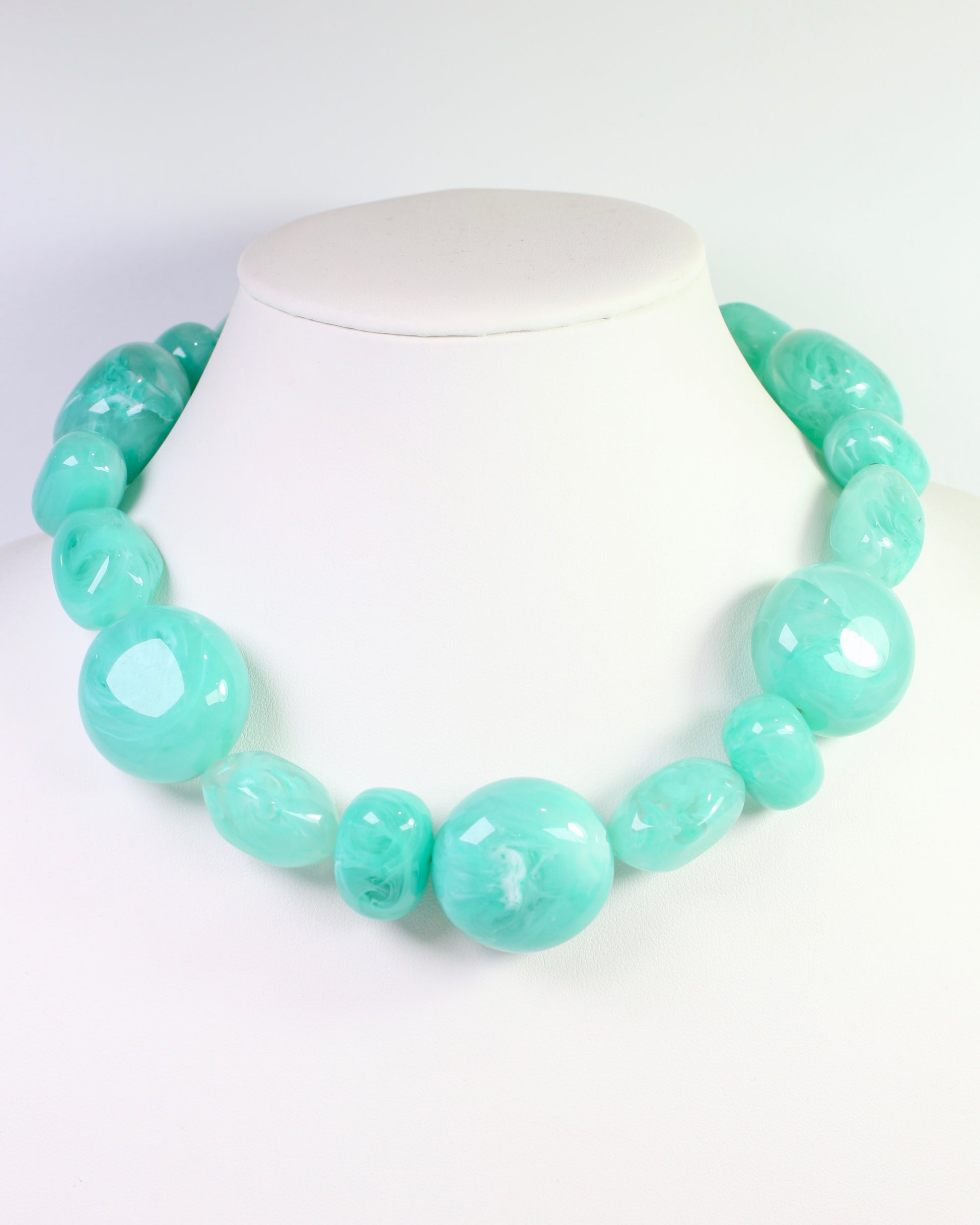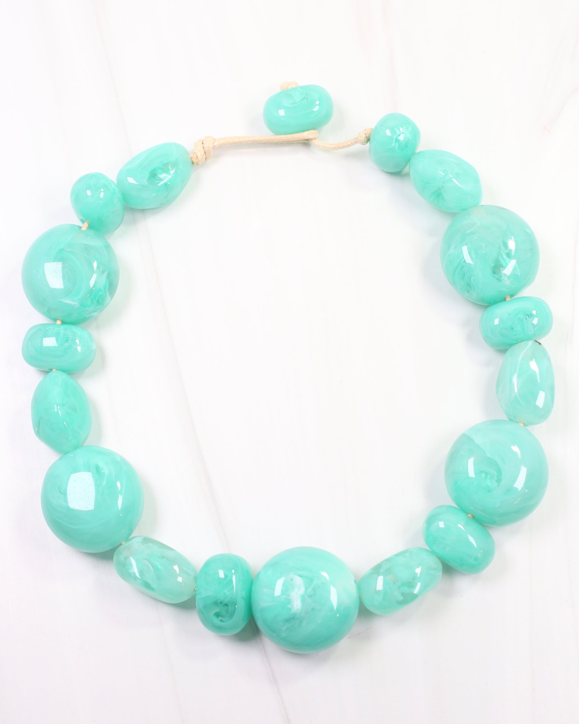 Ticonderoga Chunky Marble Necklace features bold stone variegated beads in striking aqua tones, creating an eye-catching statement piece. Each bead showcases natural color variations that add depth and visual interest to your everyday look. The convenient cord loop closure makes it effortless to slip on and off, while the chunky design delivers modern sophistication.