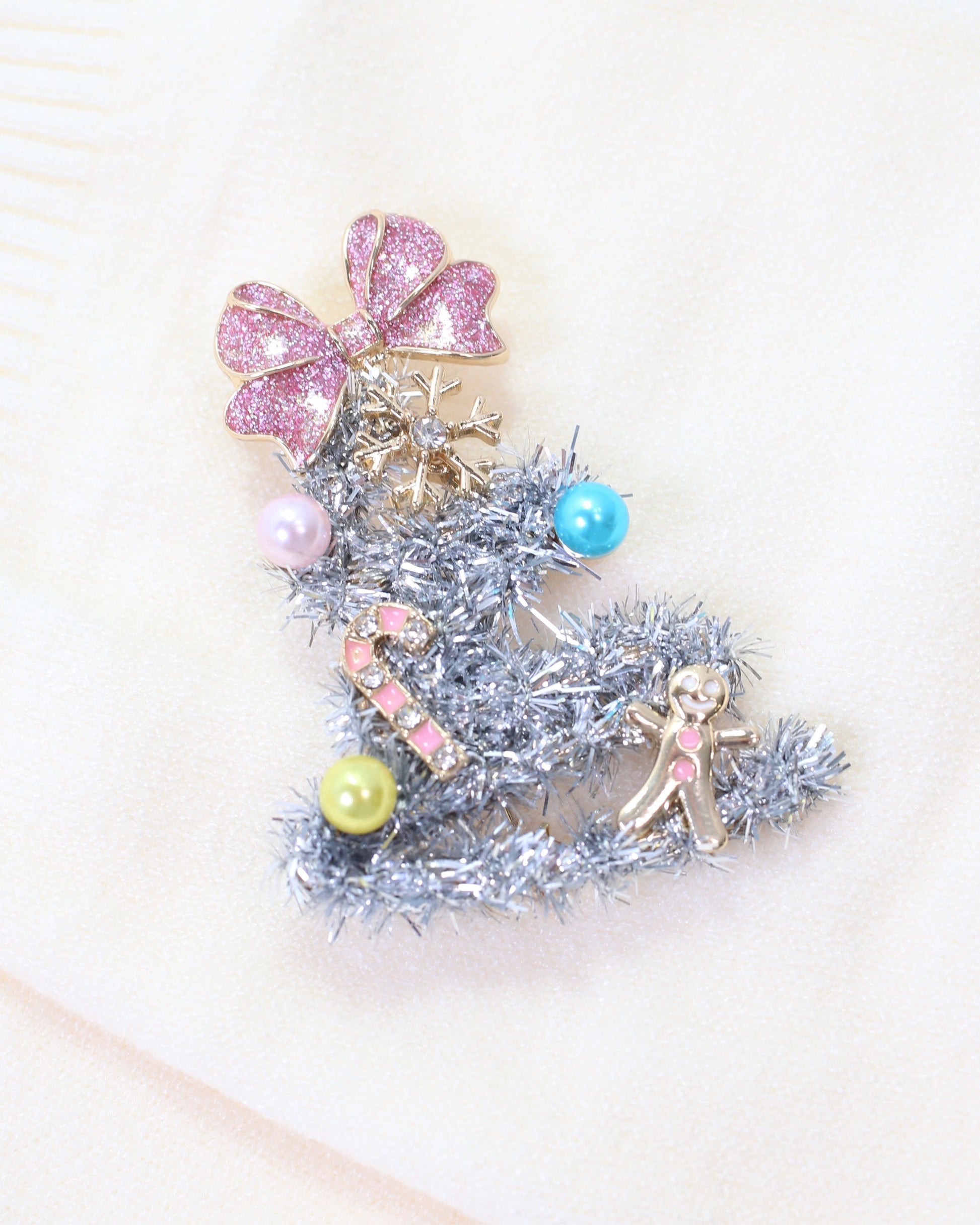 The Tis The Season Tinsel Tree Brooch in Silver captures festive whimsy with its tinsel-inspired design. Decorated with a glittery pink enamel bow, gingerbread man, candy cane, snowflake, and colorful ornaments, this playful pin adds a stylish holiday spirit to any outfit.