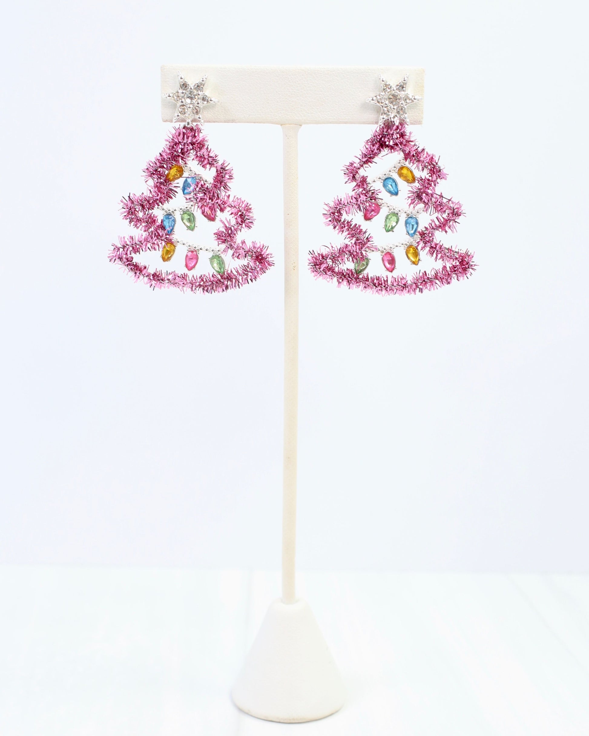 The Tis the Season Tinsel Tree Earrings in pink feature an open tinsel tree design adorned with colorful crystal ornaments and a sparkling crystal star post. Lightweight and festive, these earrings offer a fun, fashionable way to celebrate the holiday season.
