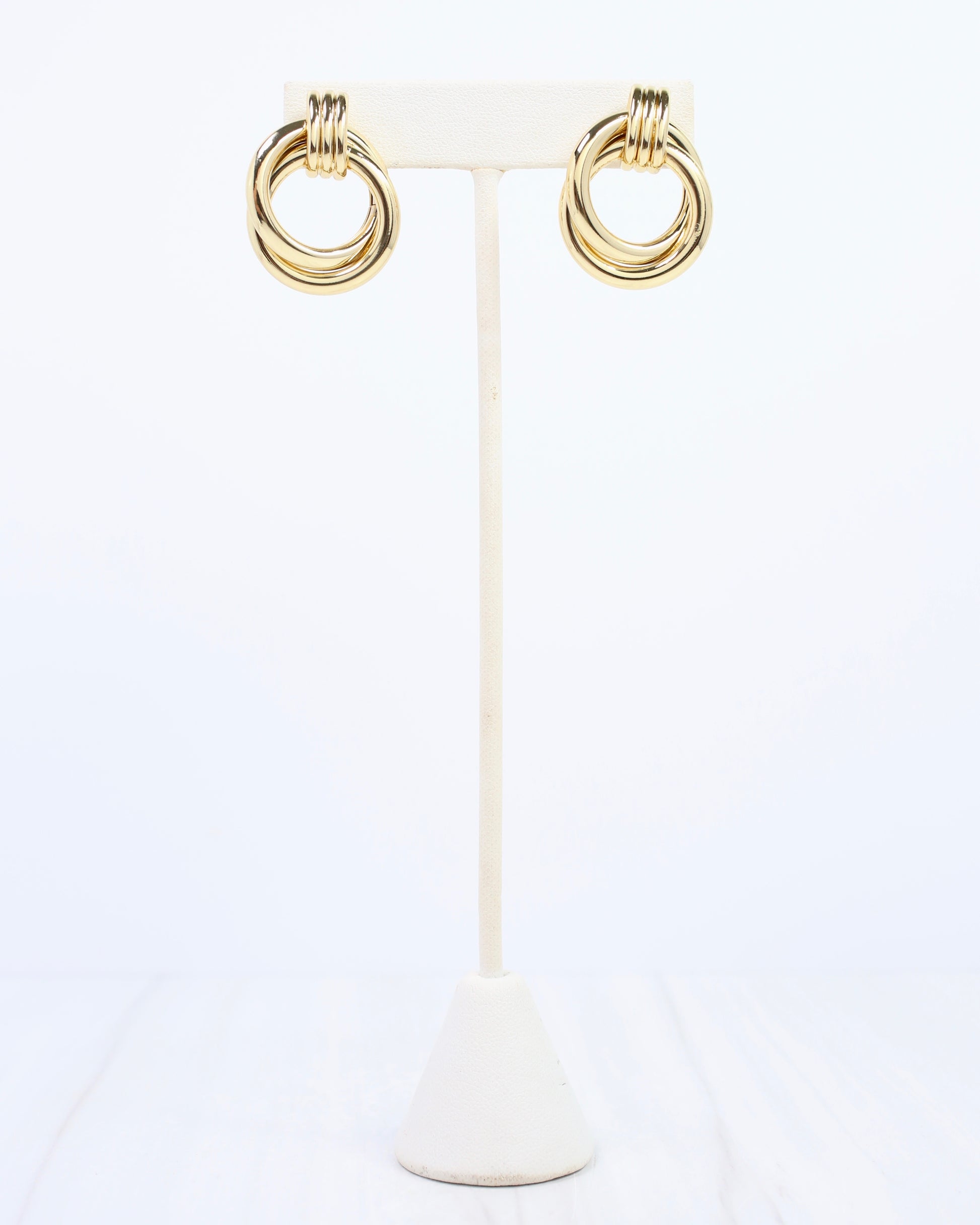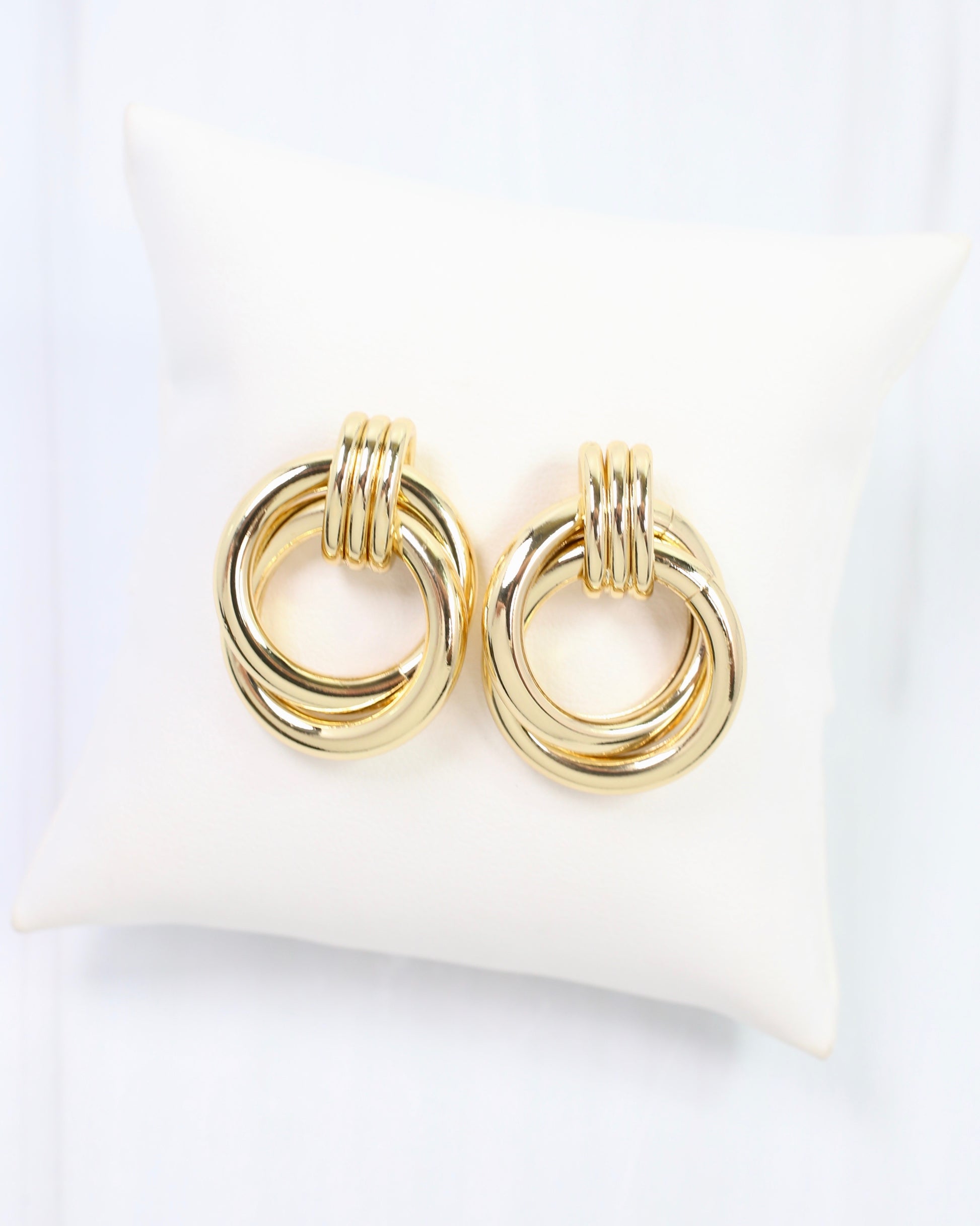 The Tucson Drop Earring in gold features a door knocker style with a triple-line stud and a double circle drop. Its classic and chic design adds a fashionable touch to any ensemble, making it a versatile accessory for both casual and dressy occasions.