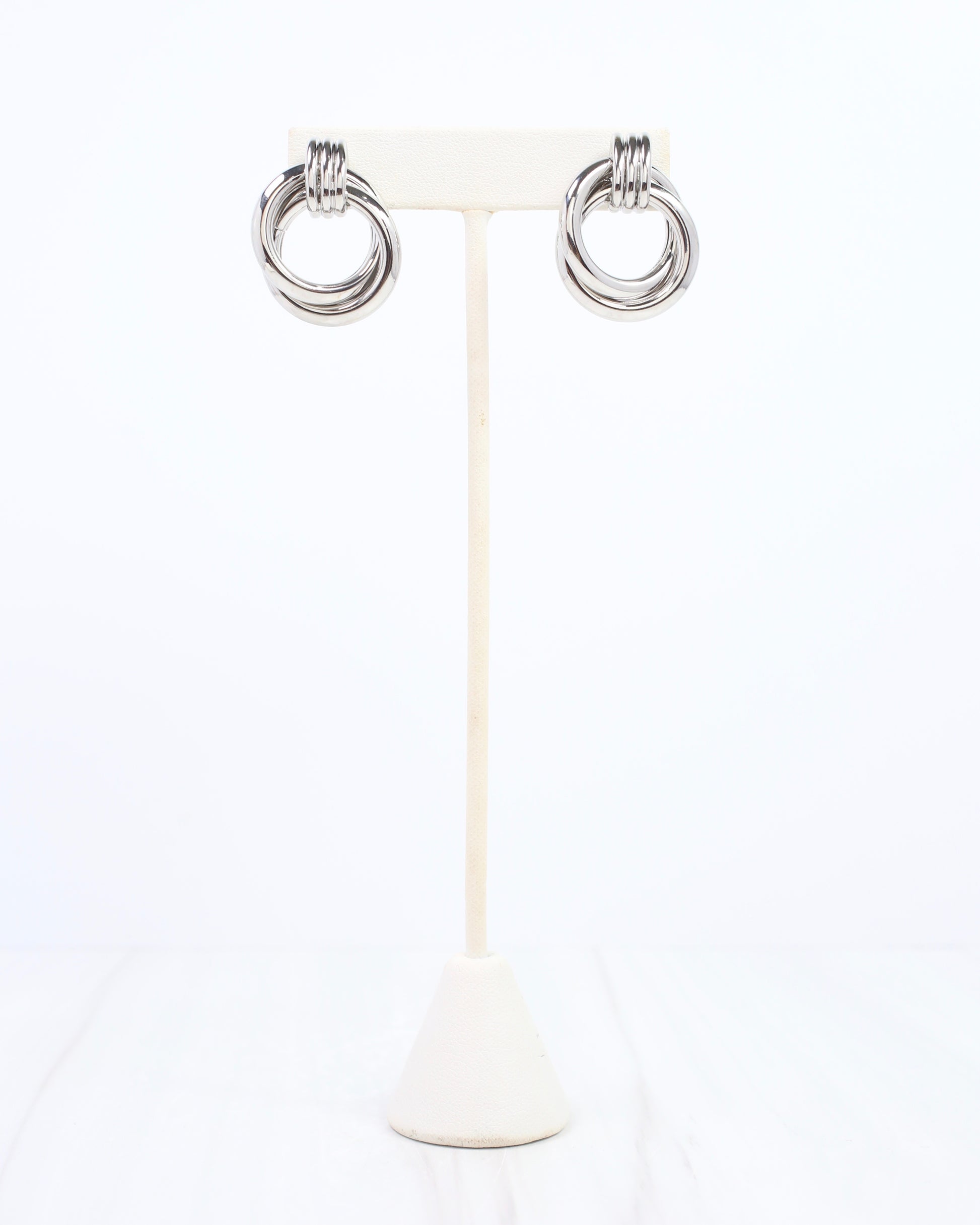 The Tucson Drop Earring in silver features a door knocker style with a triple-line stud and a double circle drop. Its classic and chic design adds a fashionable touch to any ensemble, making it a versatile accessory for both casual and dressy occasions.