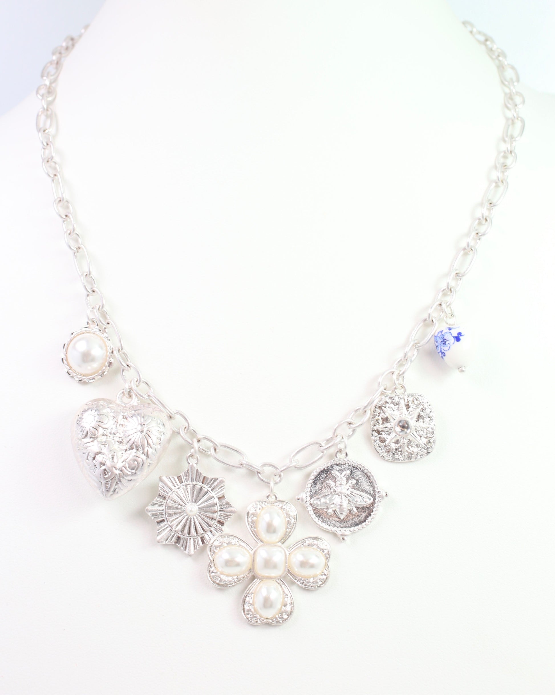 Add a touch of vintage charm to your outfit with the Verona Silver and Pearl Charm Necklace. The worn gold finish and seven unique charms, including a vintage cross and bumble bee, make for a stylish and playful statement piece. Perfect for any occasion.