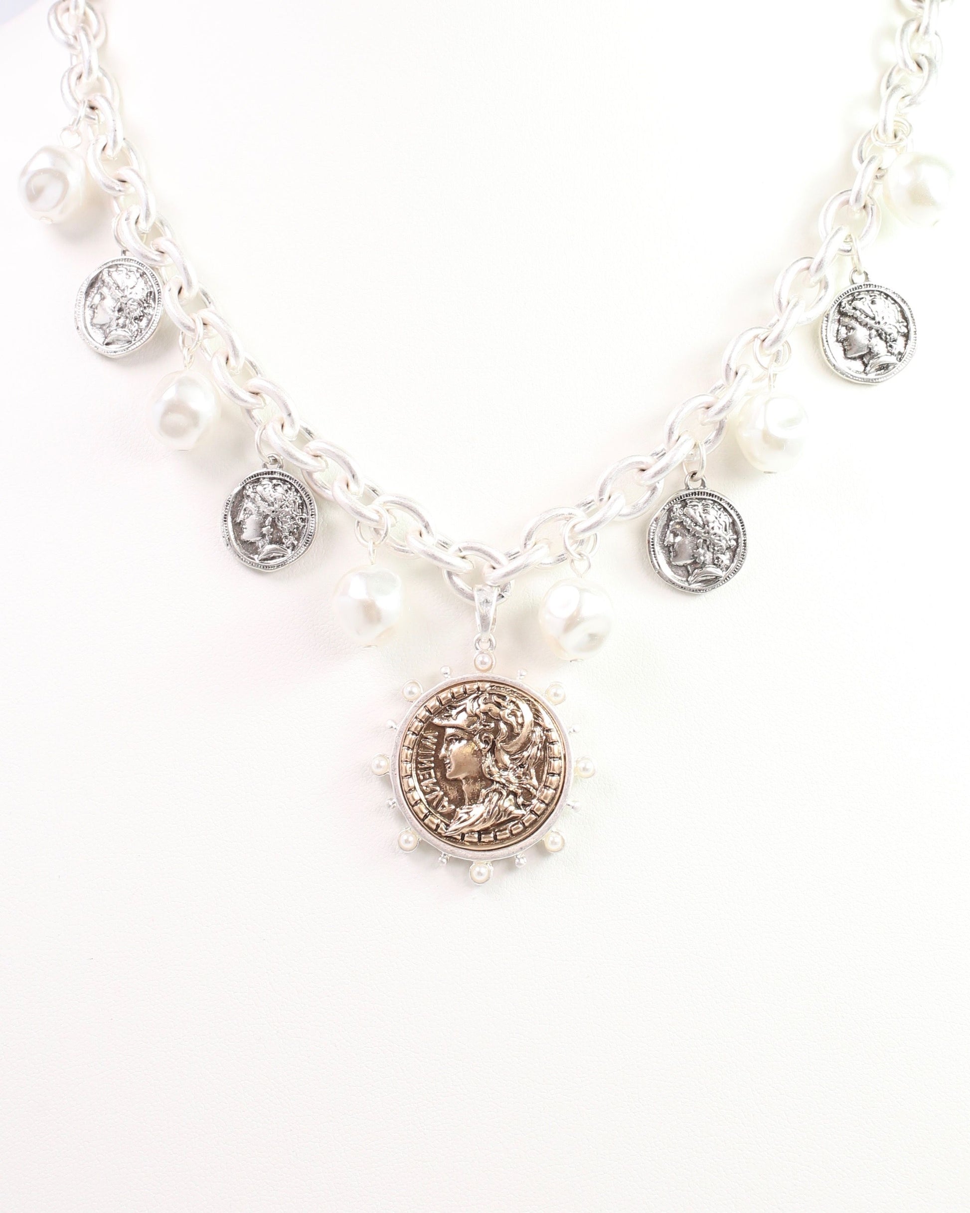 Make a statement with our Victoria Charm Necklace in Worn Silver. Adorned with antique-style coins and pearl drops, this necklace exudes vintage charm. Perfect for adding a touch of unique elegance to any outfit.