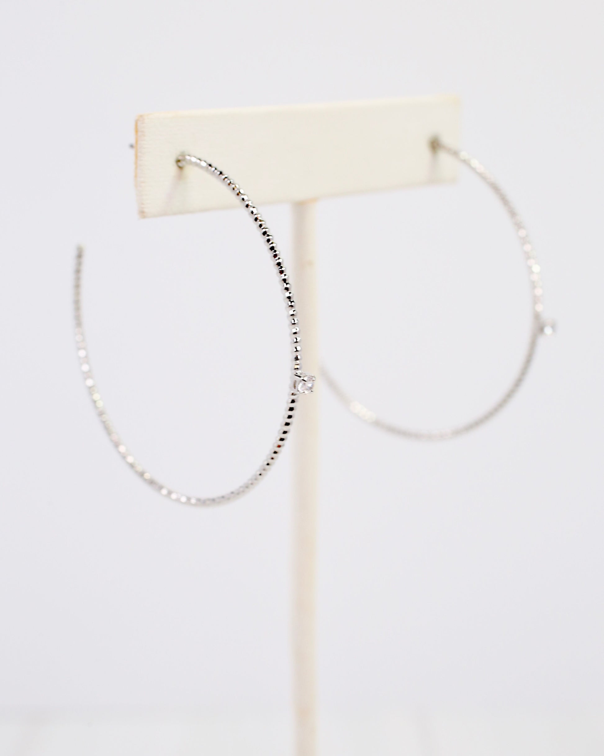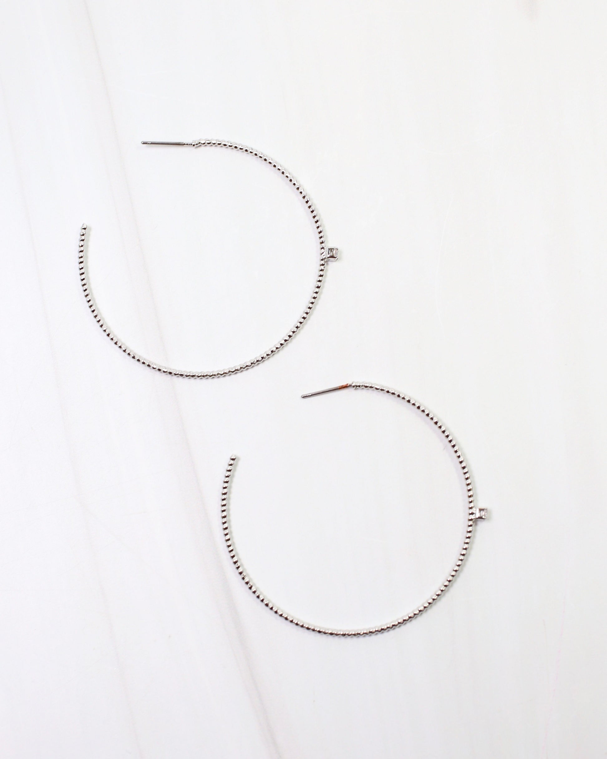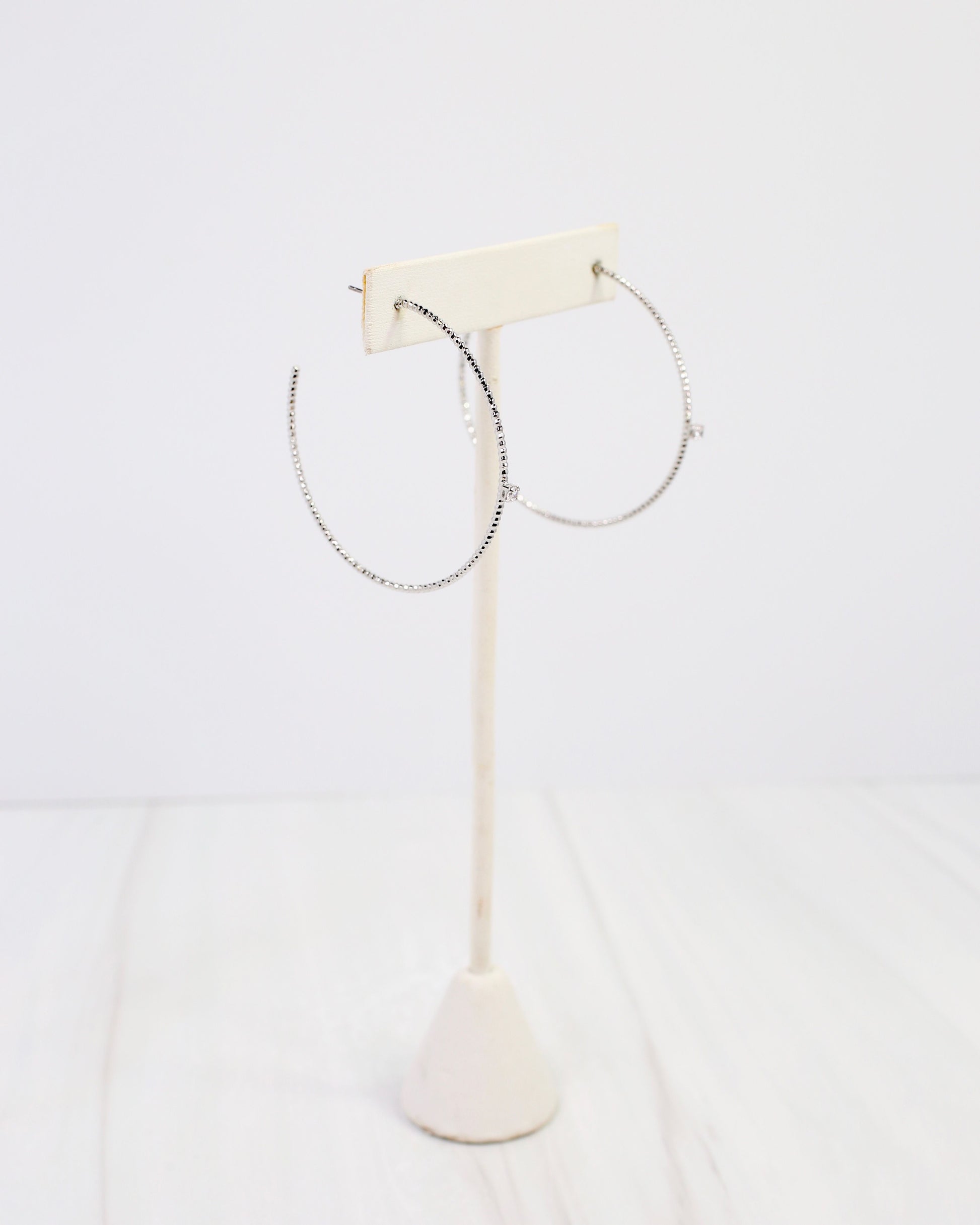 Sleek silver hoops with a textured finish that adds dimension and sophistication. Versatile enough for everyday wear or evening occasions, these statement earrings elevate any look with modern elegance.