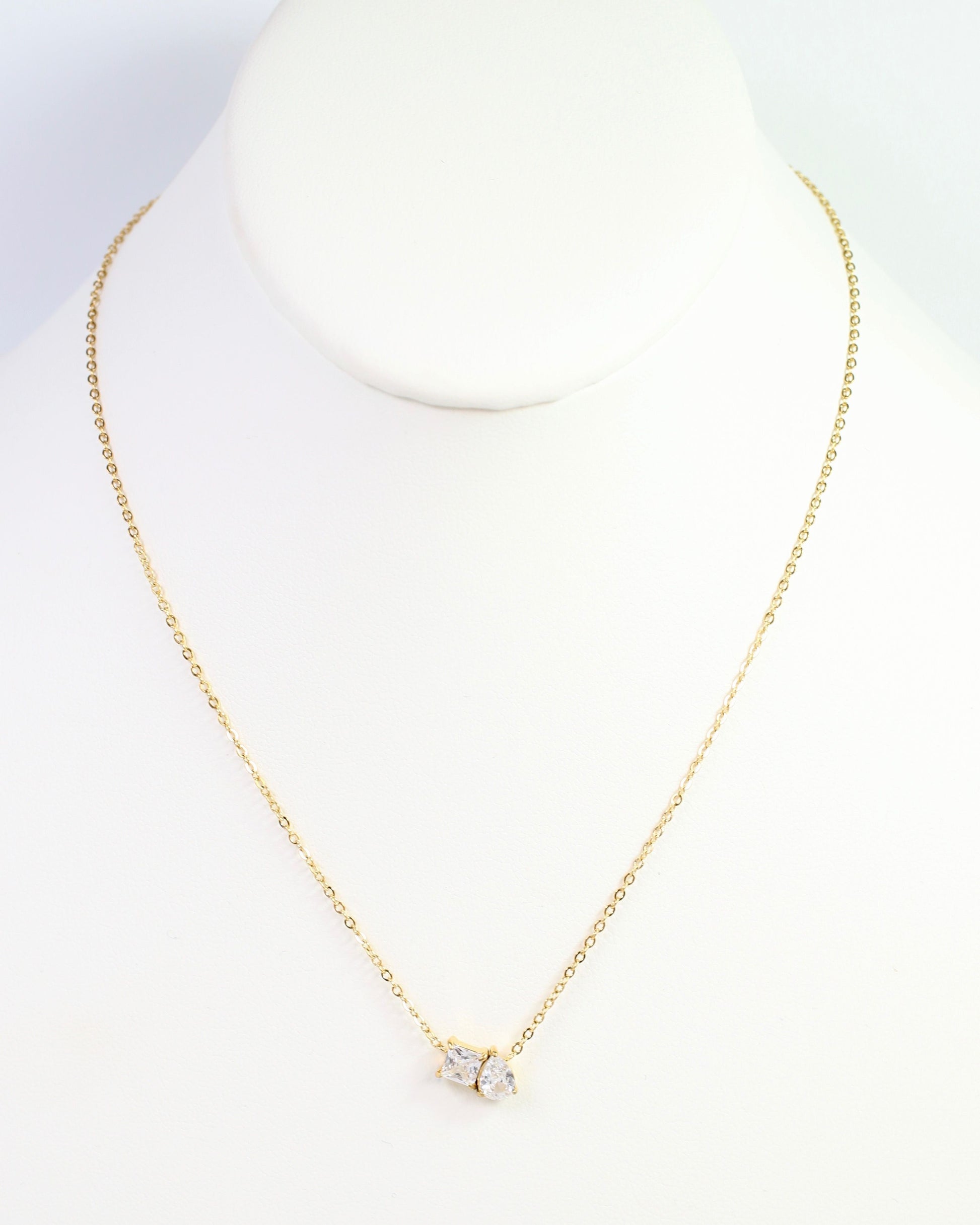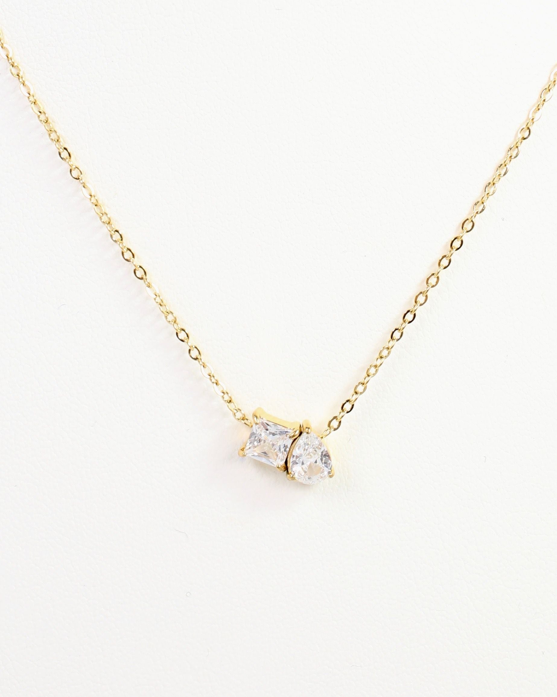 Shine bright with the Windsor CZ Necklace in Gold, featuring two sparkling CZ charms in elegant square and teardrop shapes joined together. This chic piece adds a playful sparkle and stylish sophistication to any outfit, making it a must-have accessory for adding a fun, fashionable touch to your look.