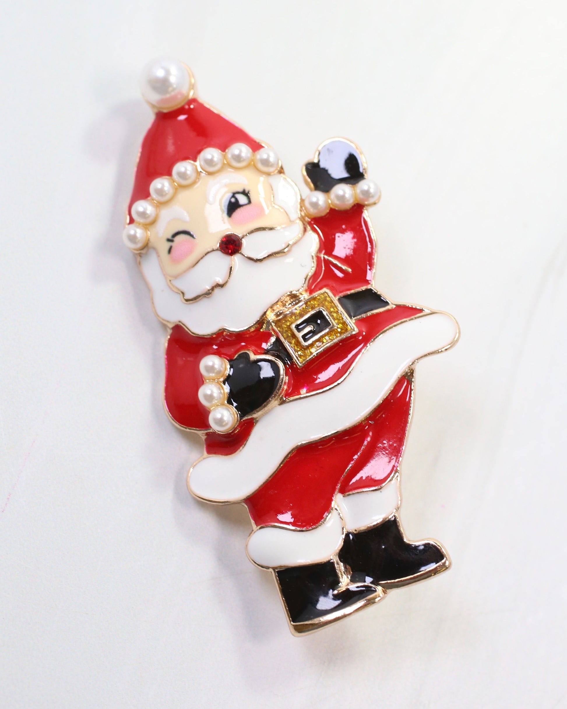 The Winking Santa Brooch in Red features a vintage-inspired pink enamel Santa accented with delicate pearl details. This stylish pin adds a playful yet elegant touch, perfect for showcasing your holiday spirit with a fashionable twist.