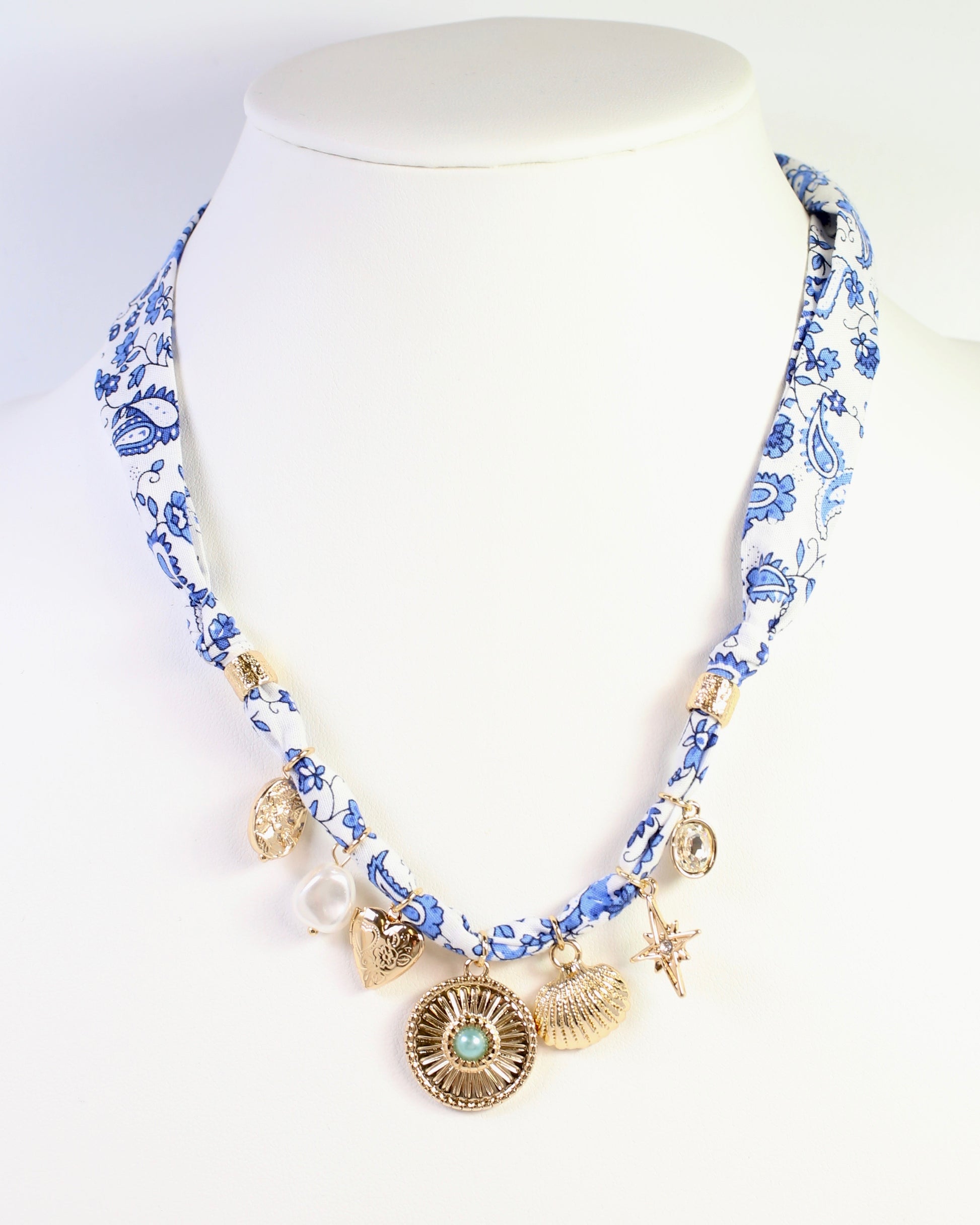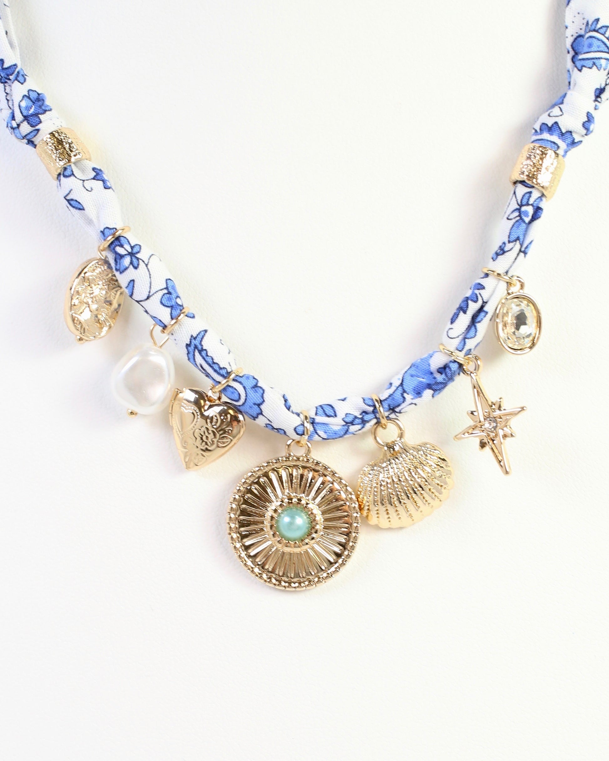 Bring a playful preppy vibe with the Winnie Scarf Charm Necklace in Blue. This crisp white cotton scarf showcases a charming blue paisley and floral print, knotted with seven delightful charms—including star, stone, pearl, locket, shell, and a center medallion—finished with two elegant gold sliders. A fresh and fun accessory to brighten your day!