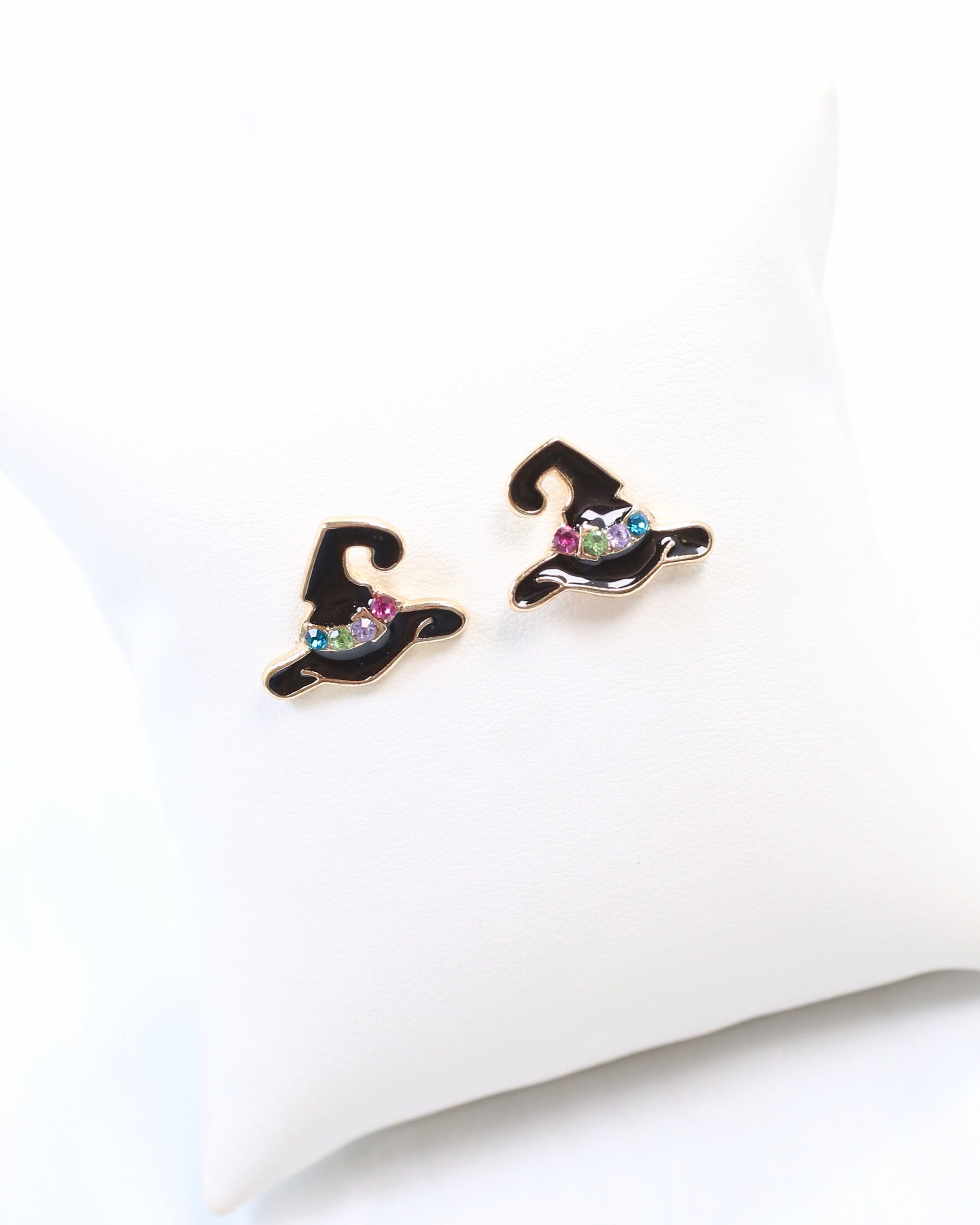 Add a touch of magic to your look with the Witchful Thinking Stud Earrings in Black. These enamel witch hat studs feature vibrant multicolored crystals that catch the light beautifully, making them a playful yet chic accessory for any outfit.