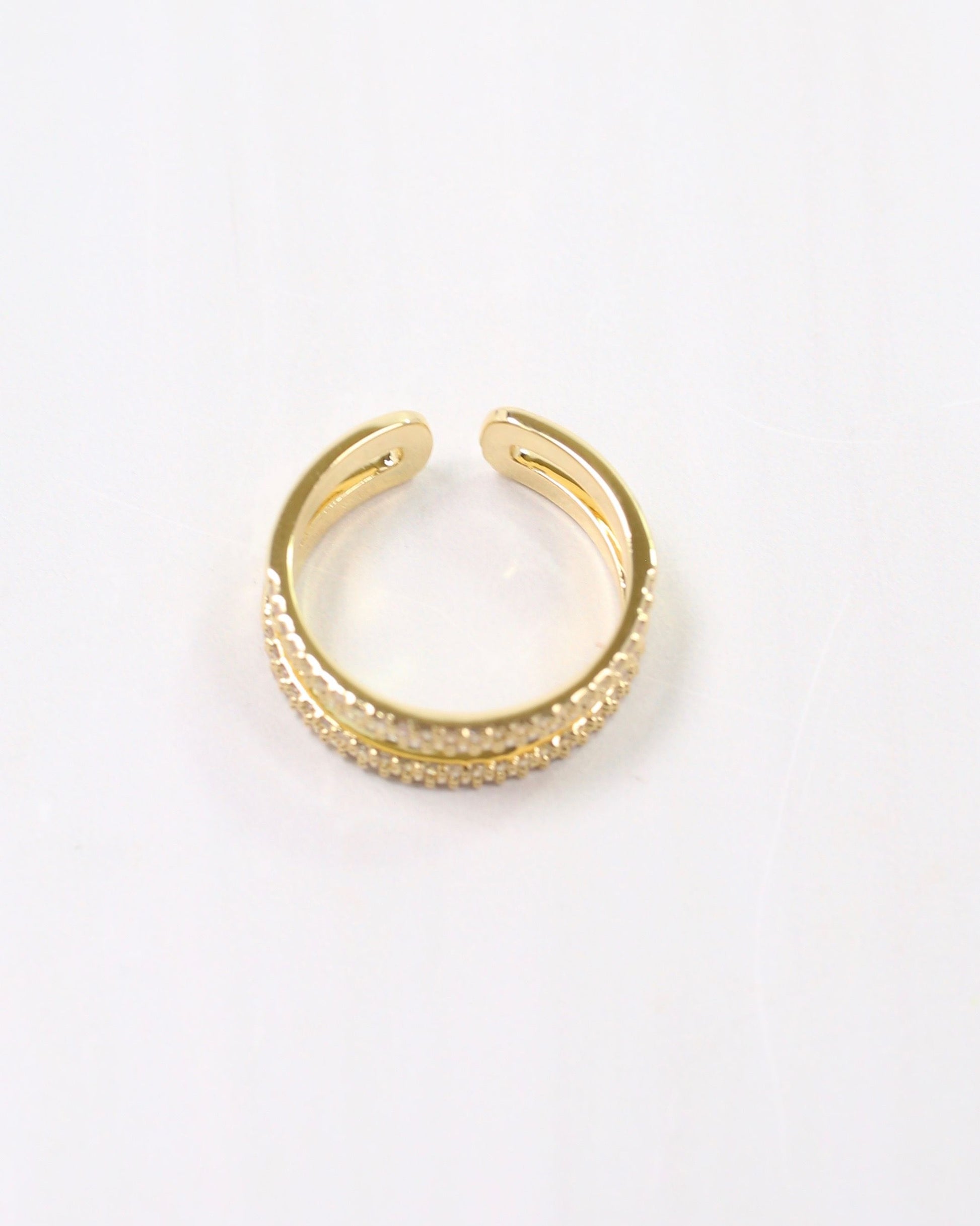Elevate your style with the Wrightsville Ring in Gold, featuring a double-layer open pave band that adds refined sparkle. Crafted from gold-dipped brass, this adjustable ring offers both elegance and versatility, making it a timeless addition to any jewelry collection.
