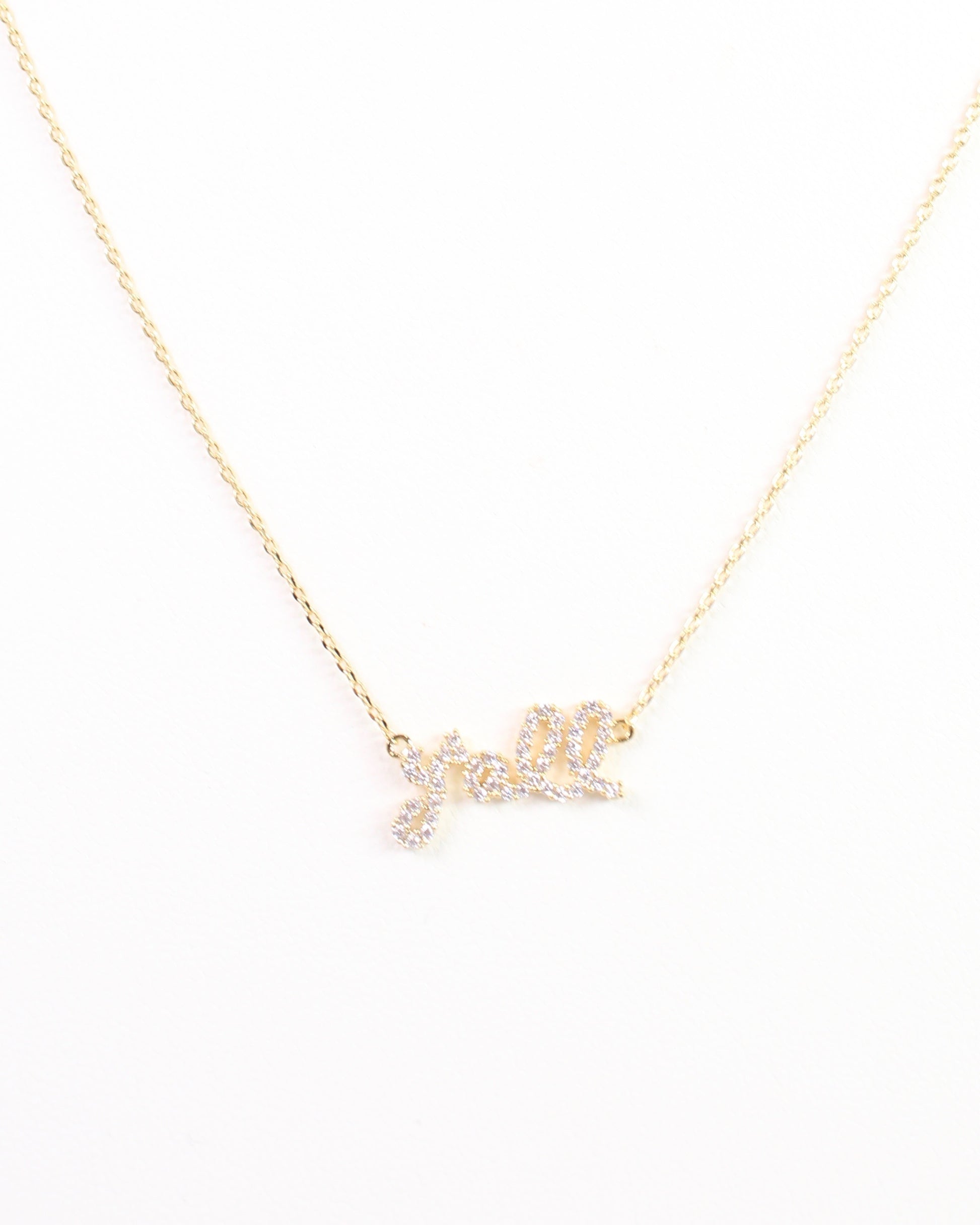 Add a playful southern charm to your look with the Y'all Pave Necklace Gold. This adorable layer-worthy piece brings a touch of sparkle and sweetness, making it a must-have for every southern girl’s jewelry collection. Perfect for stacking or wearing solo, it’s the effortless finishing touch to any outfit.