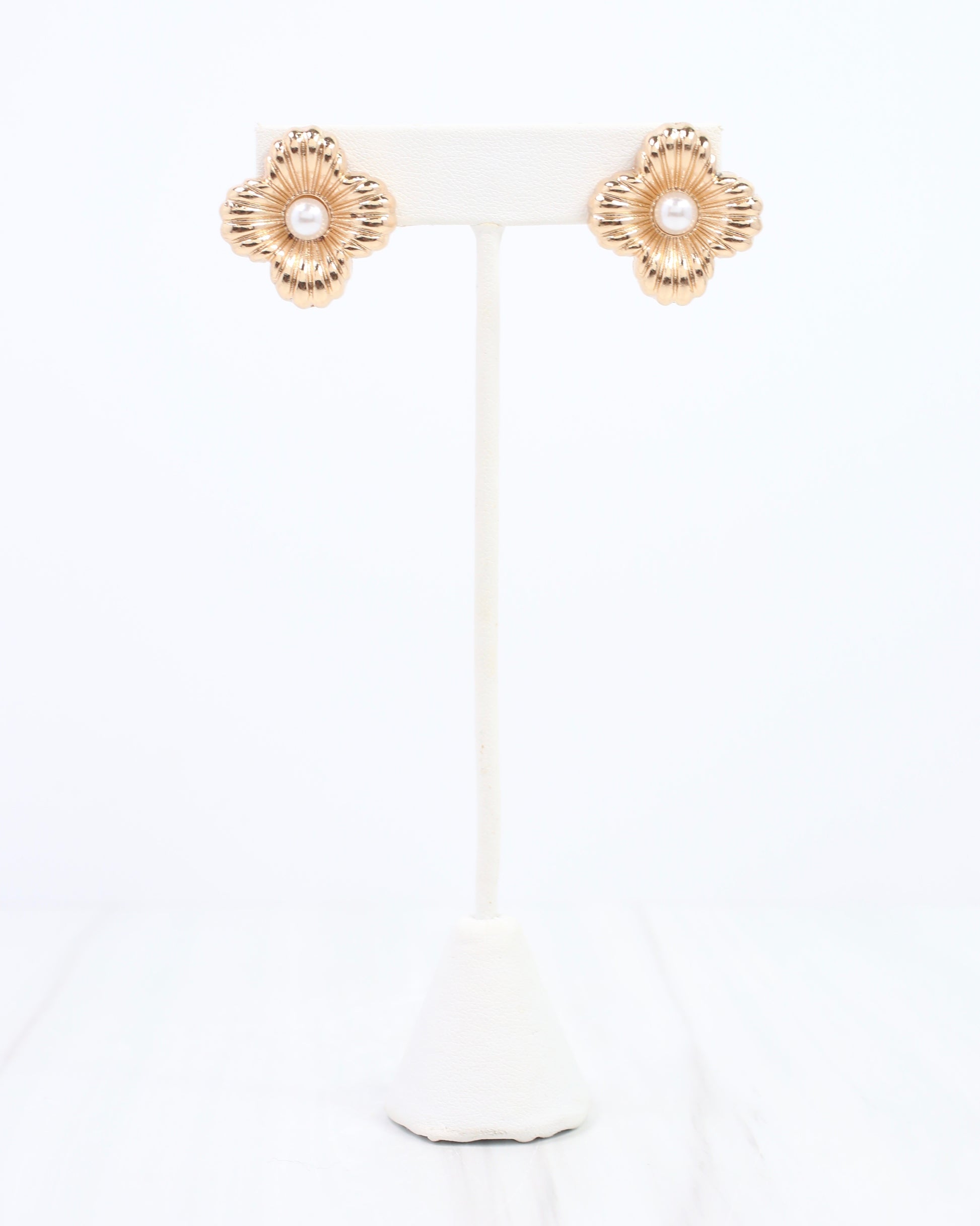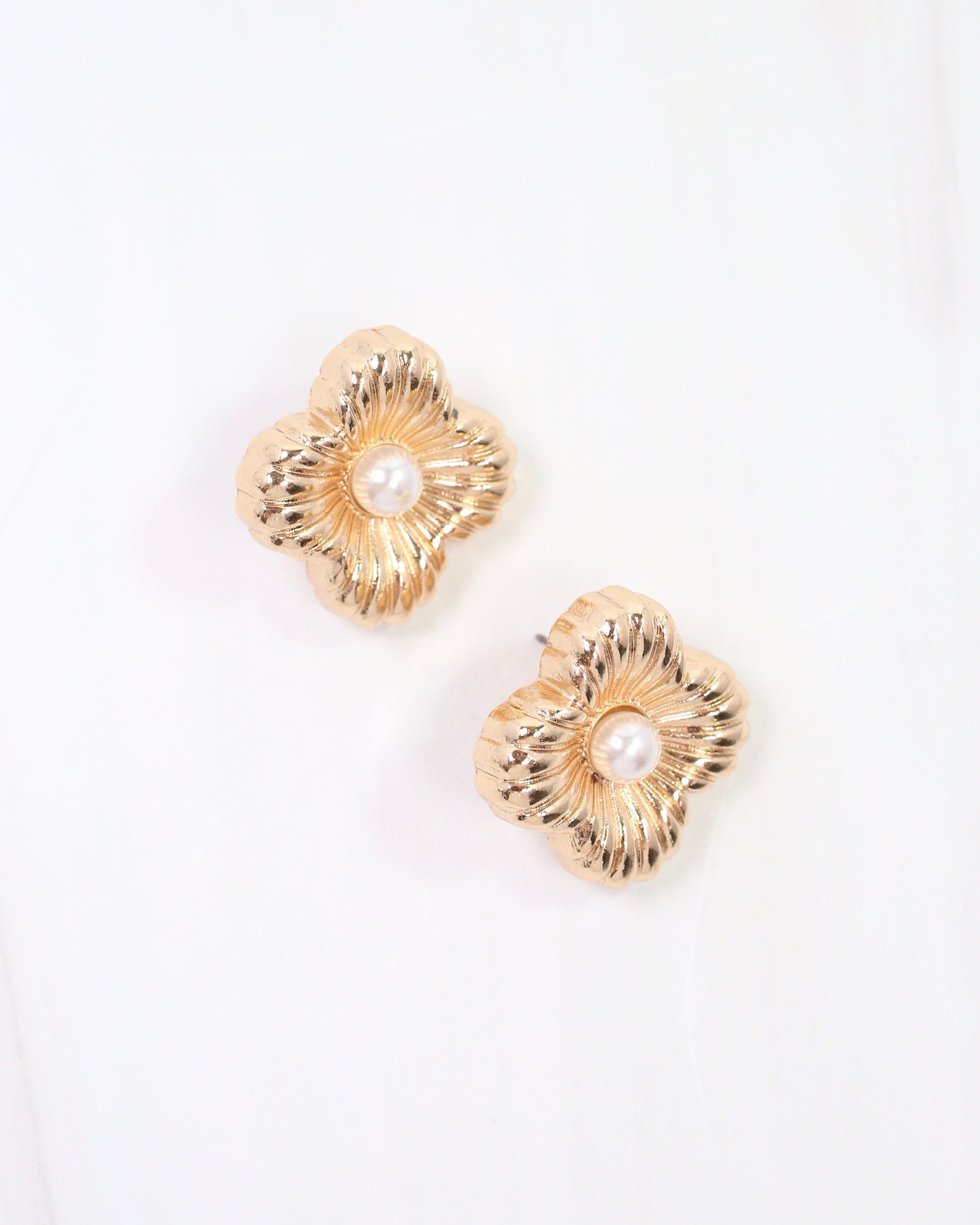 Elevate your everyday look with the Zinnia Textured Clover Stud Earring in Gold. Featuring a ribbed clover design that delicately cradles a single pearl at its center, these earrings add a refined touch of elegance. Perfect for making a subtle yet stylish statement.